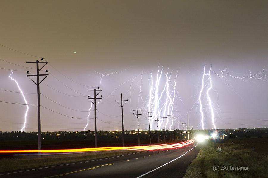 Lightning bolts cloud to ground striking the front range foothills of the Colorado Rocky Mountains in Boulder County. A view of the Twin Peaks Mount Meeker 13911 and Longs Peak 14256 in the distance. This storm came in fast about 8:30 pm one thing I have learned about Colorado Lightning storms in the springtime... they come in fast and do not last long. For me as soon as I saw some flashed in the sky out the door and landed where I could to get a composition view of Longs Peak. As I was set up shooting a farmer showed up to deliver 8 boxes of live bees he told me hopefully it will all go well. Lucky for me it did. The Lightning was all over in less than twenty minutes. It moved north but died out. Looking forward to the warmer weather when the lightning in the storm lasts a little longer. There are 8 Lightning images in the series. This is number four. Here are my settings for this Lightning session. ISO 100 - 20sec - f5.6 - 28mm. A layered of 4 images equal to an 80 sec exposure. Hope you enjoy them. Fine art nature landscape lightning photography prints decorative canvas prints acrylic prints and stock images by By James Bo Insogna C 2012 - All Rights Reserved.