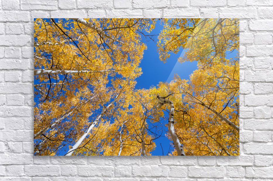 Here is a golden view on a blue sky sunny day with perfect weather upward to the sun in an aspen forest. West Boulder County Colorado.