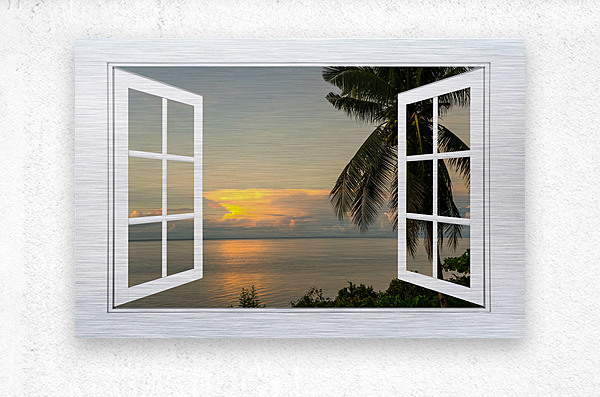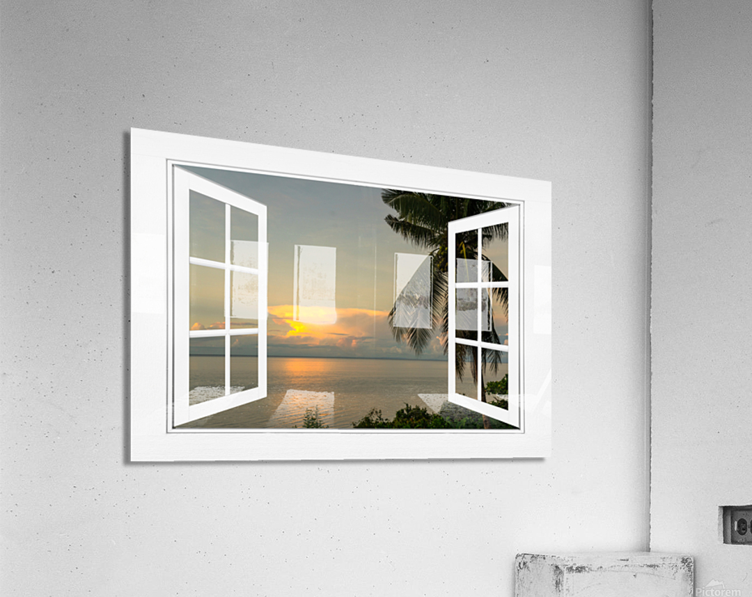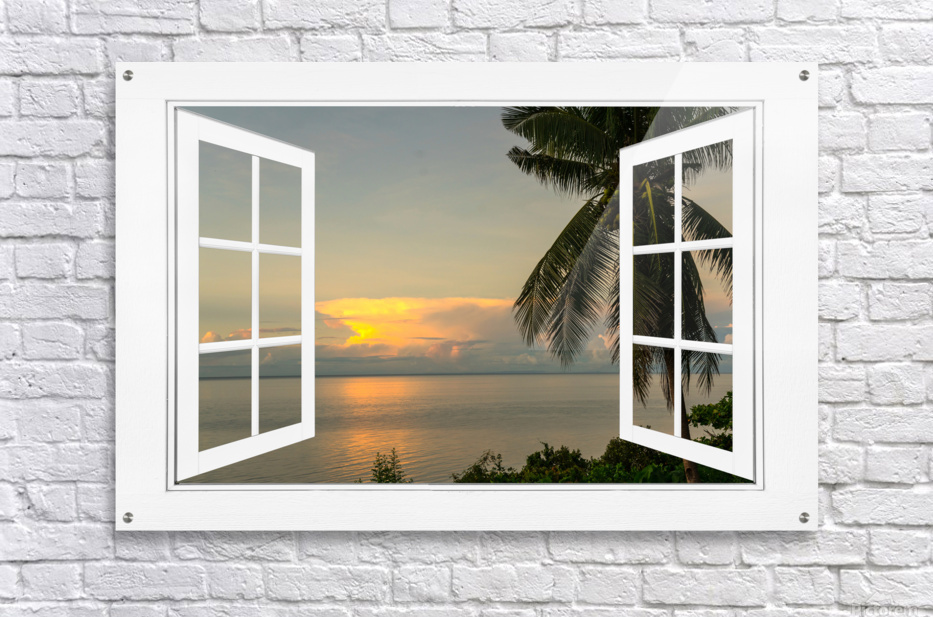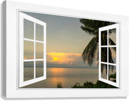 ABOUT THIS ARTWORK: TROPICAL SUNSET WHITE OPEN WINDOW FRAME VIEW