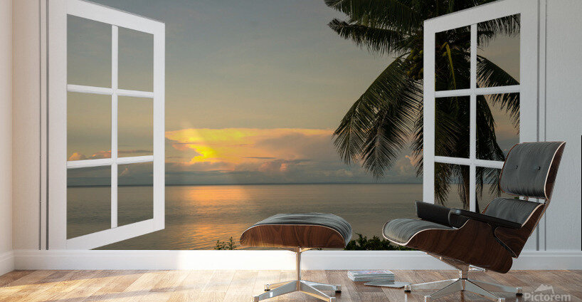 Tropical coconut tree view of a beautiful sunset sky on the ocean with a view through an open white picture window frame. A fantasy fine art photography window optical illusion into a tropical paradise. A fantastic window to have in a bedroom basement office or in a kitchen... all for a room with a view. Bring nature indoors now you can add a window with a view to any room in your home or office with our picture window frame fine art striking photography nature landscape art prints. The IMAGE is the FRAME how cool is that! Question: Do you have a home or office room without any windows? Do you want to set the mood in a room decor? Do you dream of a room with a view? The Answer: Now you can have a window with a view in any room with our NEW picture window frame fine art striking photography nature landscape prints all with a view and ready to hang by photographer James Bo Insogna. This is an incredible way to decorate your office walls home walls cafe restaurant boardroom waiting room trade booth corporation or almost any commercial space. Museum-quality art with fast secure worldwide shipping to your door.