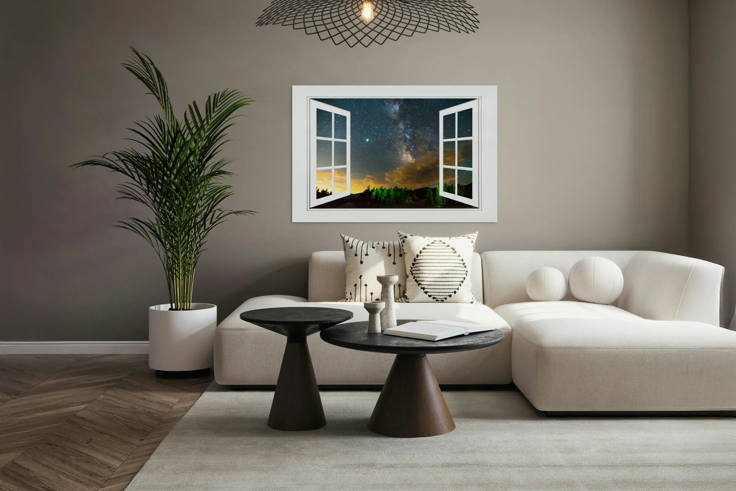 Colorful Milky Way rising out of the clouds above wilderness forest trees view through an open white picture window frame. A fantasy fine art photography window optical illusion into a beautiful colorful lake view. A fantastic window to have in a bedroom, basement, office, or kitchen for a room with a view. Bring nature indoors now you can add a window with a view to any room in your home or office with our picture window frame fine art striking photography nature landscape art prints. The IMAGE is the FRAME how cool is that! Question: Do you have a home or office room without any windows? Do you want to set the mood in a room decor? Do you dream of a room with a view? The Answer: Now you can have a window with a view in any room with our NEW picture window frame tm fine art striking photography nature landscape prints all with a view and ready to hang by photographer James Bo Insogna This is an incredible way to decorate your office walls home walls cafe restaurant boardroom waiting room trade booth corporation or almost any commercial space. Museum-quality art with fast secure worldwide shipping to your door.