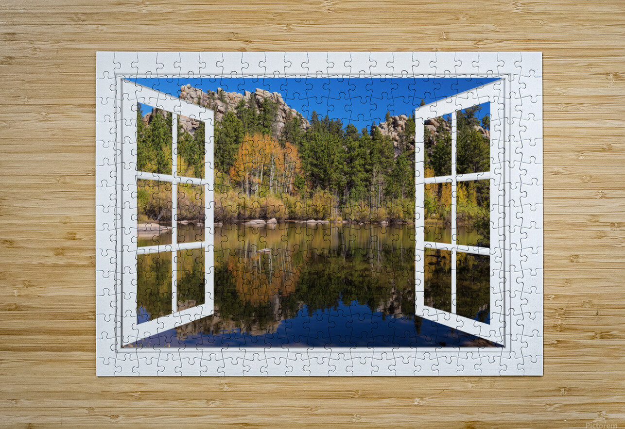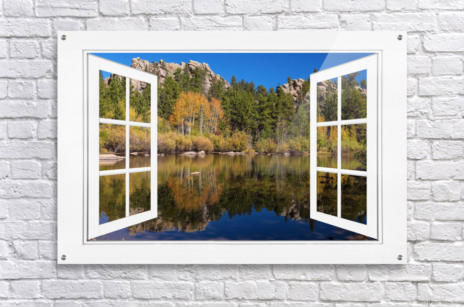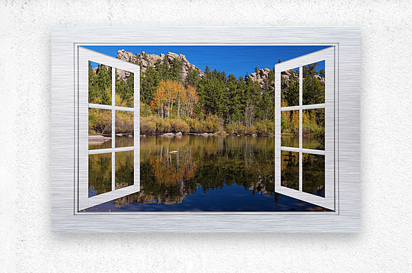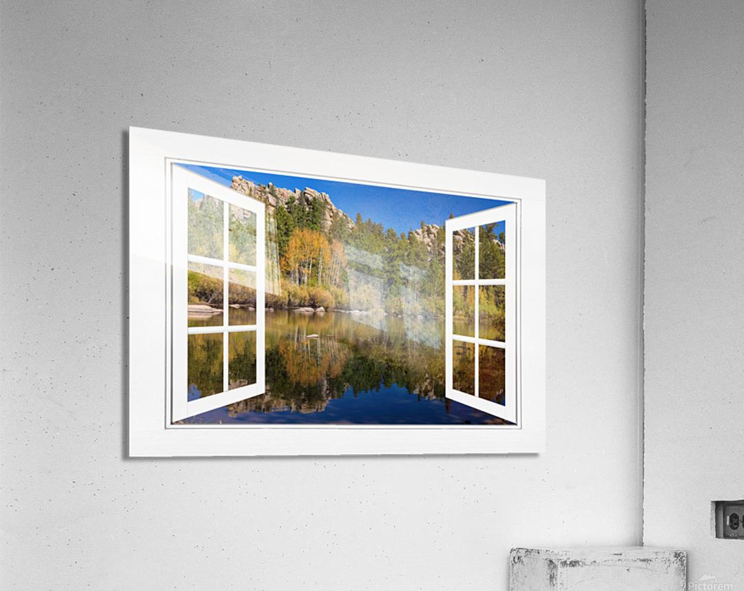 Open Window View of one of the beautiful lakes in the Rocky Mountain Red Feather Lakes Area. Autumn colors reflect in the calm clear lake water. A fantasy fine art photography open window optical illusion of a beautiful peaceful calming lakeside view. Makes you want to put a fishing rod out. A cool window to have in an office, den, family room, or any space that needs a window. Bring nature indoors now you can add a window with a view to any room in your home or office with our picture window frame fine art striking photography nature landscape art prints. The IMAGE is the FRAME how cool is that! Question: Do you have a home or office room without any windows? Do you want to set the mood in a room decor? Do you dream of a room with a view? The Answer: Now you can have a window with a view in any room with our NEW picture window frame fine art striking photography nature landscape prints all with a view and ready to hang by photographer James Bo Insogna . This is an incredible way to decorate your office walls home walls cafe restaurant boardroom waiting room trade booth corporation or almost any commercial space. Museum-quality art with fast secure worldwide shipping to your door.