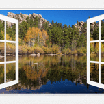 Open Window View of one of the beautiful lakes in the Rocky Mountain Red Feather Lakes Area. Autumn colors reflect in the calm clear lake water. A...[+]