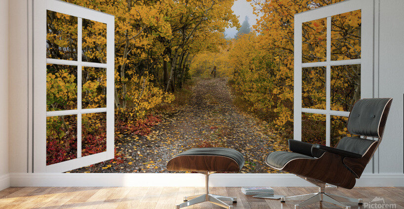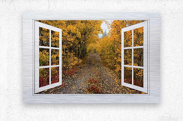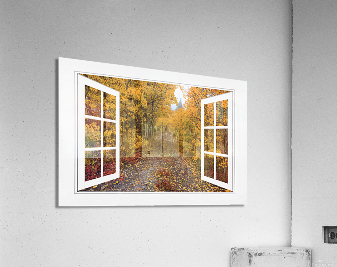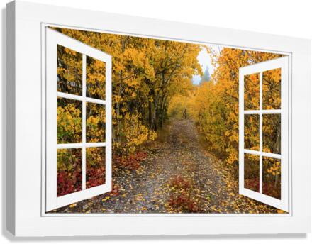 Landscape scenic colorful golden autumn trees with a view through an open white picture window frame. A fantasy fine art photography window optical illusion into the woods. A fantastic window to have in a bedroom basement office or in a kitchen... all for a room with a view. Bring nature indoors now you can add a window with a view to any room in your home or office with our picture window frame fine art striking photography nature landscape art prints. The IMAGE is the FRAME how cool is that! Question: Do you have a home or office room without any windows? Do you want to set the mood in a room decor? Do you dream of a room with a view? The Answer: Now you can have a window with a view in any room with our NEW picture window frame fine art striking photography nature landscape prints all with a view and ready to hang by photographer James Bo Insogna This is an incredible way to decorate your office walls home walls cafe restaurant boardroom waiting room trade booth corporation or almost any commercial space. Museum-quality art with fast secure worldwide shipping to your door.