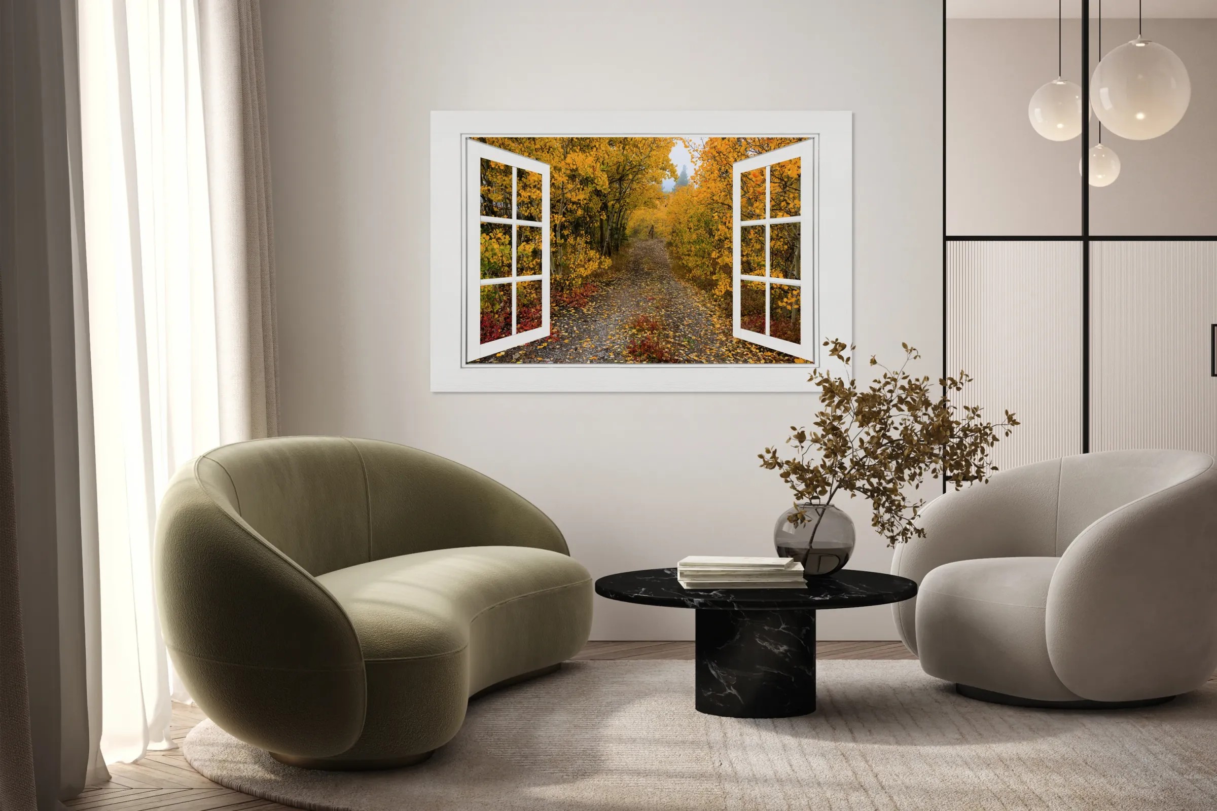 Landscape scenic colorful golden autumn trees with a view through an open white picture window frame. A fantasy fine art photography window optical ...[+]