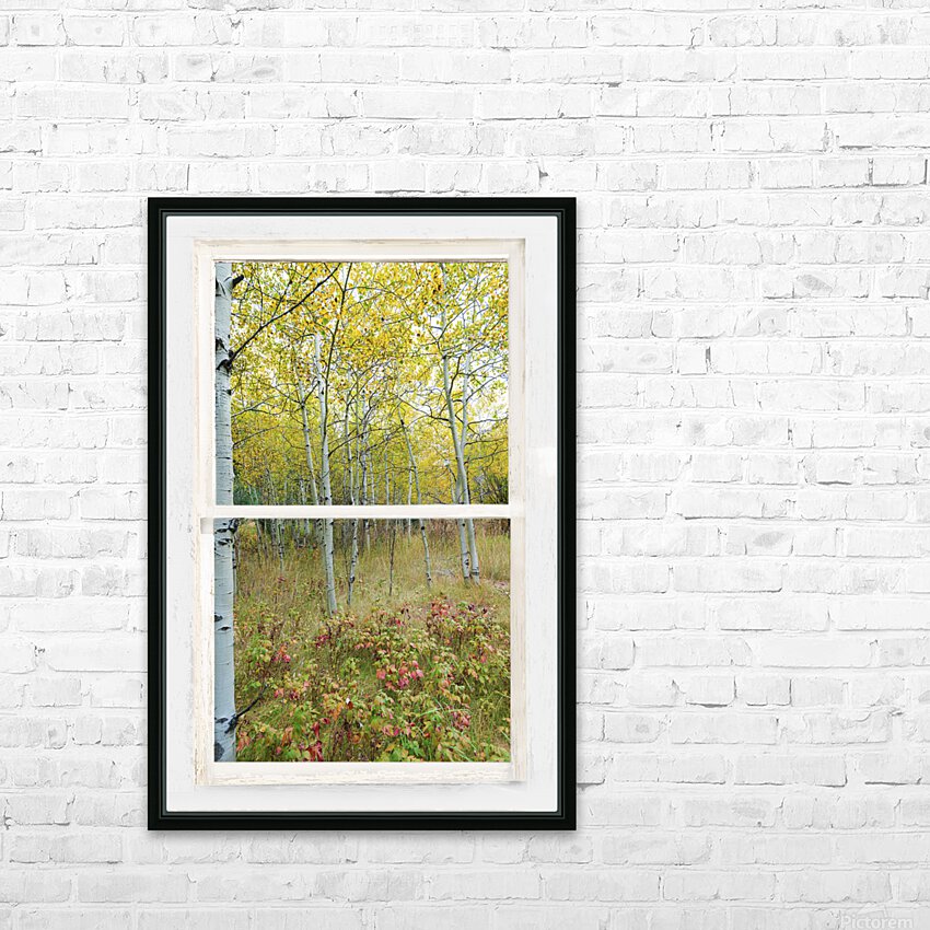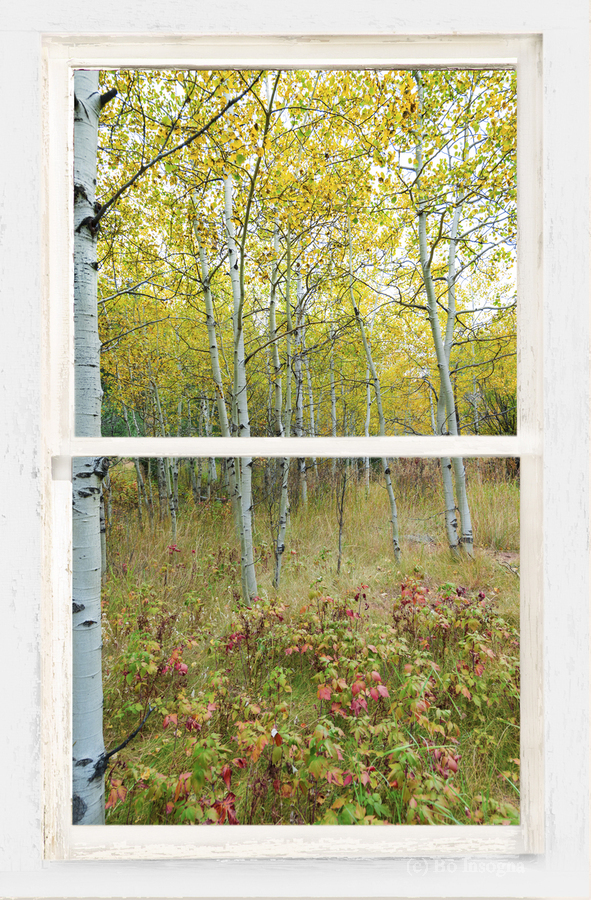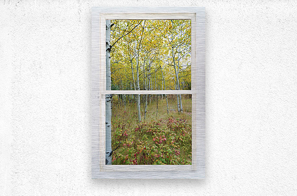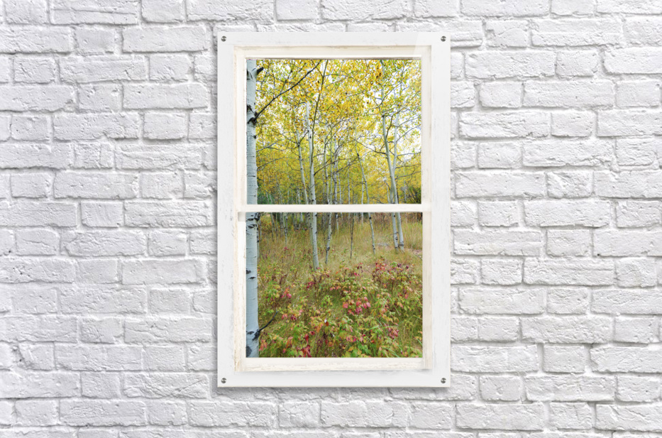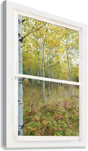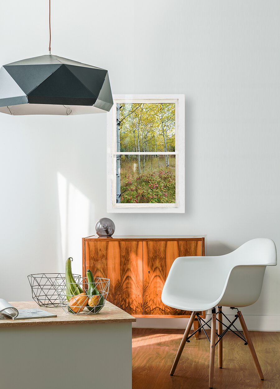 Colorful lush wilderness forest calming portrait view through a white distressed rustic picture window. Your very own private window view into beautiful autumn trees and a lush forest floor. Bring nature indoors now you can add a window with a view to any room in your home or office with our picture window fine art striking photography nature landscape canvas wraps and acrylic prints. Looking window into paradise. The Window is the frame how cool it that! C James Bo Insogna 303-934-2524