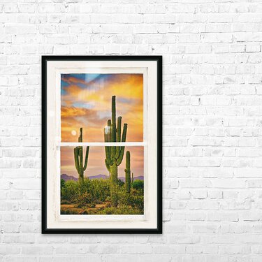 Colorful southwest desert sunset landscape with giant saguaro cactus view through a white distressed rustic picture window. A colorful southwest sunset over the lush sonoran desert with giant saguaro cactus and a view through a classic old white distressed rustic picture window. Your very own private window view into the beautiful southwest. Create a fine art photography optical illusion to your décor of the beautiful colorful southwest desert with a view through an old distressed rustic barn window . Bring nature indoors now you can add a window with a view to any room in your home or office with our picture window frame nature landscape art prints. The IMAGE is the FRAME how cool is that! Do you have a home or office room without any windows? Do you want to set the mood in a room decor? Do you dream of a room with a view? Now you can have a window with a view in any room with our picture window frame fine art striking photography nature landscape available as a poster prints canvas wrap acrylic fine art prints and metal prints all with a view and ready to hang by photographer James Bo Insogna C All Rights Reserved. This is an incredible way to decorate your window less office walls home walls cafe restaurant boardroom waiting room trade booth corporation or almost any commercial space. *PLEASE NOTE : The Window Frame is part of the image. It is recommended ordering as an Acrylic Print - Metal Print - or Stretched Canvas Wrap with white sides. **PLEASE NOTE WATERMARKS WILL NOT BE ON THE PURCHASE PRINTS*