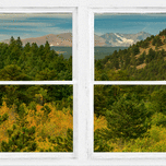 Rocky Mountain autumn season view through a classic white distressed rustic whitewashed picture window. Your very own private window view into the mo...[+]