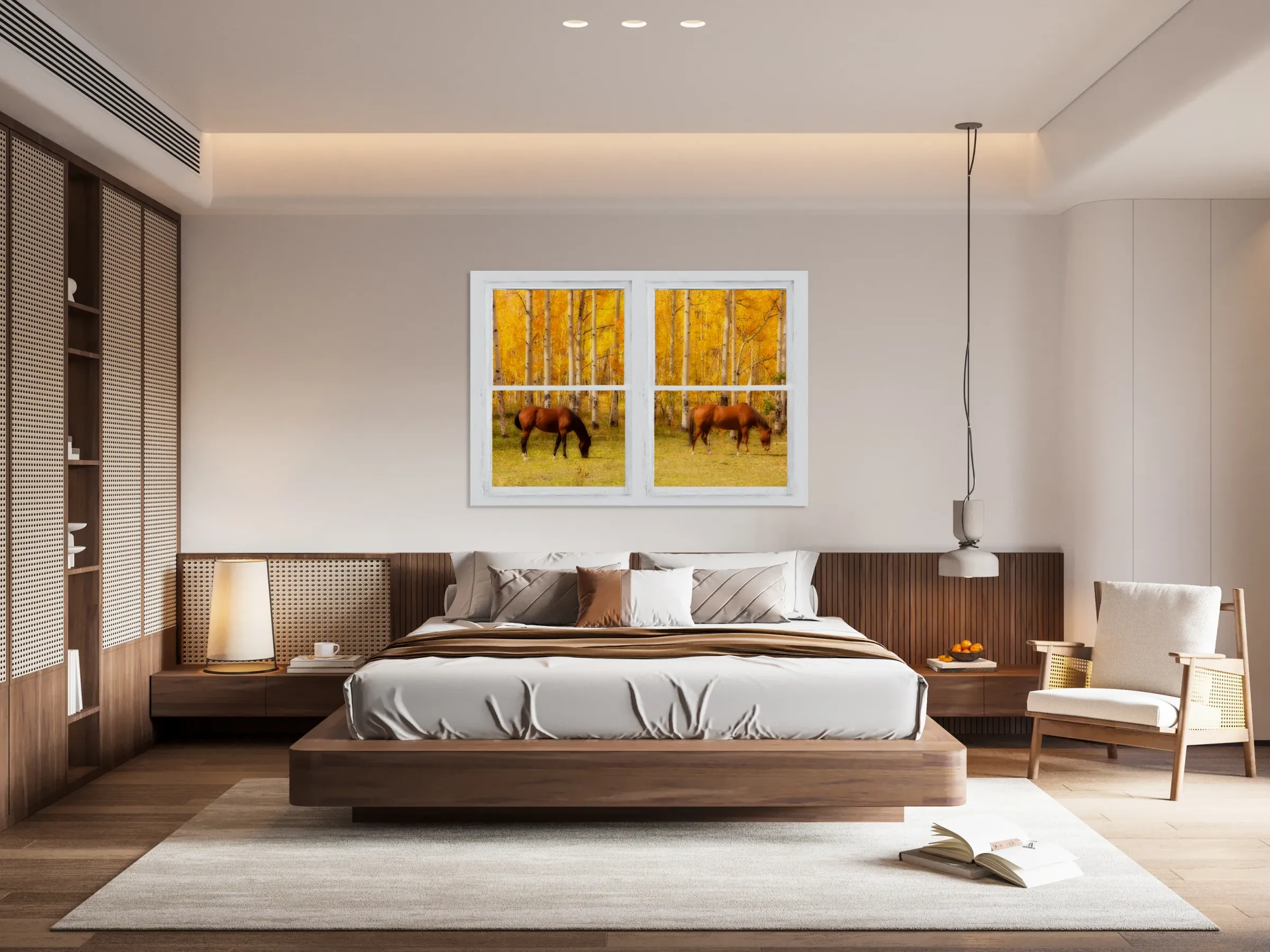 Two horses grazing in a meadow and towering autumn aspen trees with a view through a classic white distressed rustic whitewashed picture window. Your very own window view into colorful mother nature beautiful vacation view or for motivation. Create a fine art photography optical illusion to your decor of the beautiful colorful country equine view through an old distressed rustic white window . Bring nature indoors now you can add a window with a view to any room in your home or office with our picture window nature landscape art prints. The IMAGE is the FRAME how cool is that! Do you have a home or office room without any windows? Do you want to set the mood in a room decor? Do you dream of a room with a view? Now you can have a window with a view in any room with our picture window frame fine art striking photography nature landscape prints all with a view and ready to hang. This is an incredible way to decorate your window less office walls home walls cafe restaurant boardroom waiting room trade booth corporation or almost any commercial space.