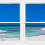 Scenic white sand beach tropical view through a classic white distressed rustic whitewashed picture window. Your very own private window view into th...[+]