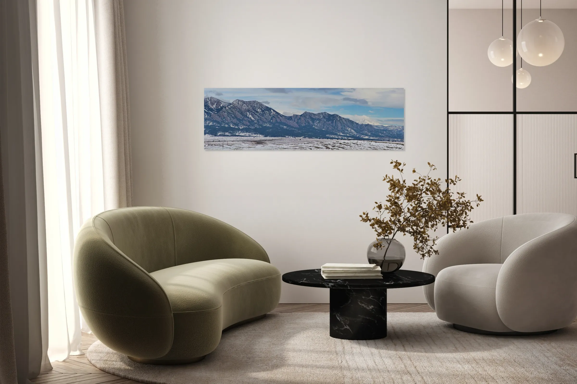 A panorama view of the Rocky Mountains front range Flatirons and Longs Peak with NCAR. Boulder Colorado. Perfect for the home decor Office decor or as a gift to a friend or love one. Order Striking Fine Art Photography by James Bo Insogna posters art prints canvas art metal art prints acrylic prints and framed art at the on-line gallery to custom your print size mat framed or unframed delivered to your door to decorate your home and office or a gift of love! Fine art nature landscape picture window frame photography poster prints decorative canvas prints acrylic prints metal prints greeting cards and stock images by By James Bo Insogna C - All Rights Reserved. 303-834-2524 *PLEASE NOTE WATERMARKS WILL NOT BE ON THE PURCHASE PRINTS*