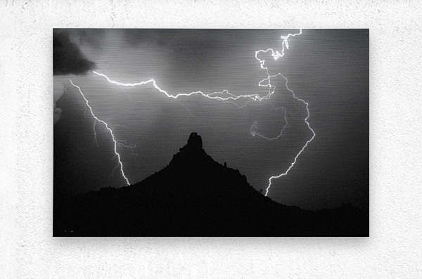 Pinnacle Peak Arizona surrounded by lightning bolts. Lightning struck on both sides and above during a monsoon thunderstorm in north Scottsdale. The original image was shot on Kodak Tri-X film and scanned to digital with a Nikon scanner. Please note: copyright watermark will not be on the final print.