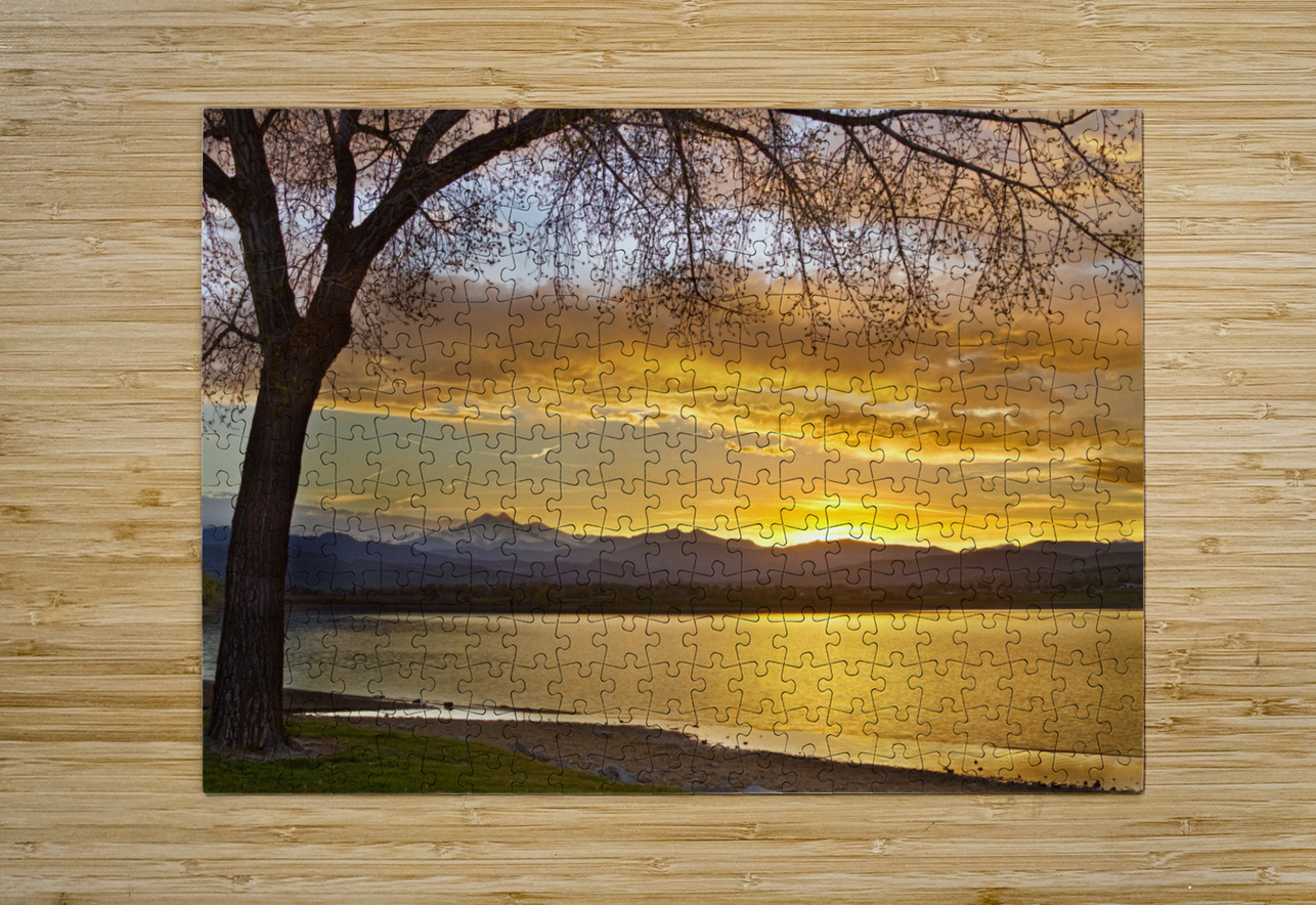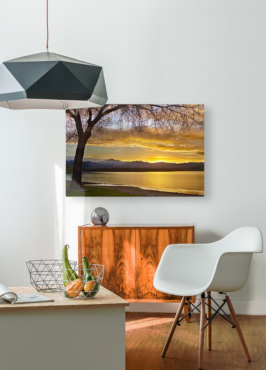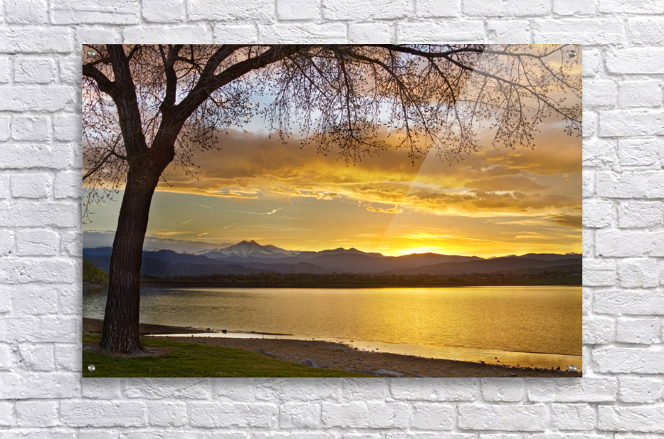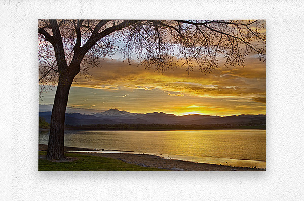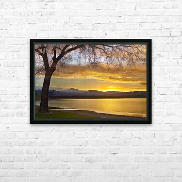 Spring time a fantastic time of year in Colorado a scenic landscape golden view of a large tree and the sun setting next to the Rocky Mountains Twin Peaks Mt Meeker 13,911 feet and Longs Peak 14,256 feet McIntosh Lake Longmont Colorado Boulder County. *PLEASE NOTE WATERMARKS WILL NOT BE ON THE PURCHASE PRINTS*