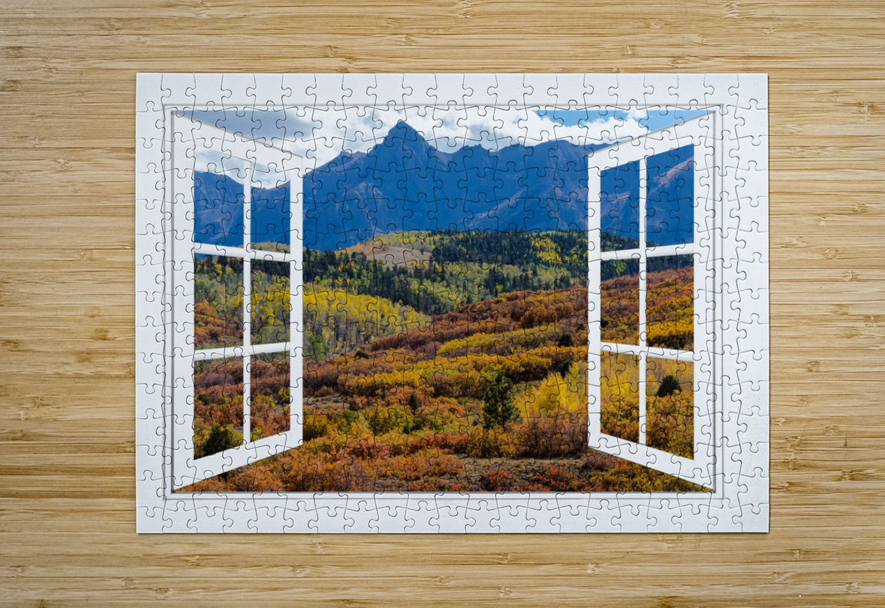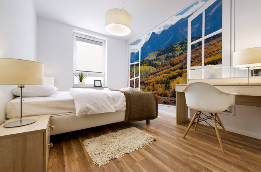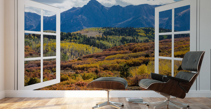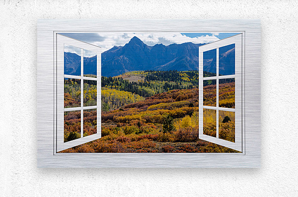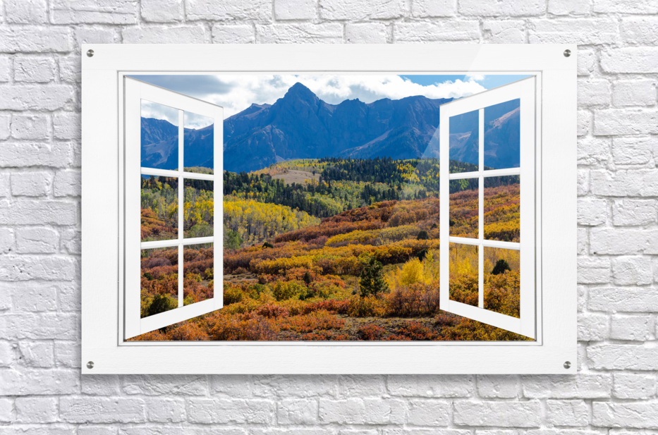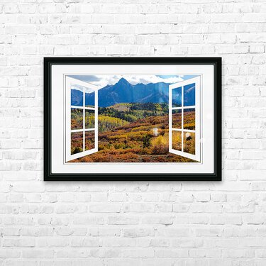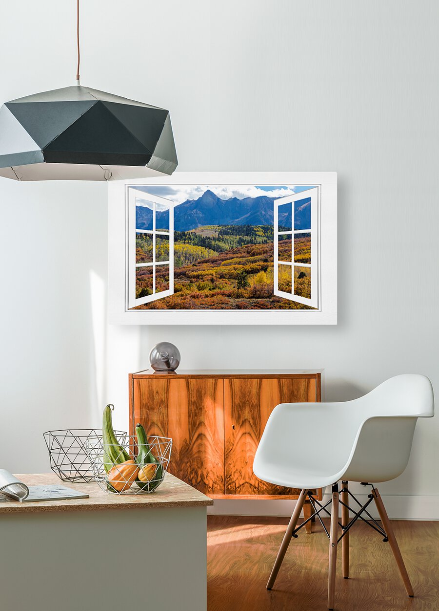 A scenic view of the colorful autumn fall foliage of the Rocky Mountains through an open white picture window frame. A fantasy fine art photography window optical illusion into the majestic landscapes of the Colorful San Juan Mountains. Bring nature indoors now you can add a window with a view to any room in your home or office with our picture window frame tm fine art striking photography nature landscape art prints. The IMAGE is the FRAME how cool is that! Question: Do you have a home or office room without any windows? Do you want to set the mood in a room decor? Do you dream of a room with a view? The Answer: Now you can have a window with a view in any room with our NEW picture window frame tm fine art striking photography nature landscape poster prints canvas wraps acrylic fine art prints and metal prints all with a view and ready to hang by photographer James Bo Insogna C - All Rights Reserved. www.BoInsogna.com This is an incredible way to decorate your office walls home walls cafe restaurant boardroom waiting room trade booth corporation or almost any commercial space. Museum quality art with fast secure world wide shipping to your door.
