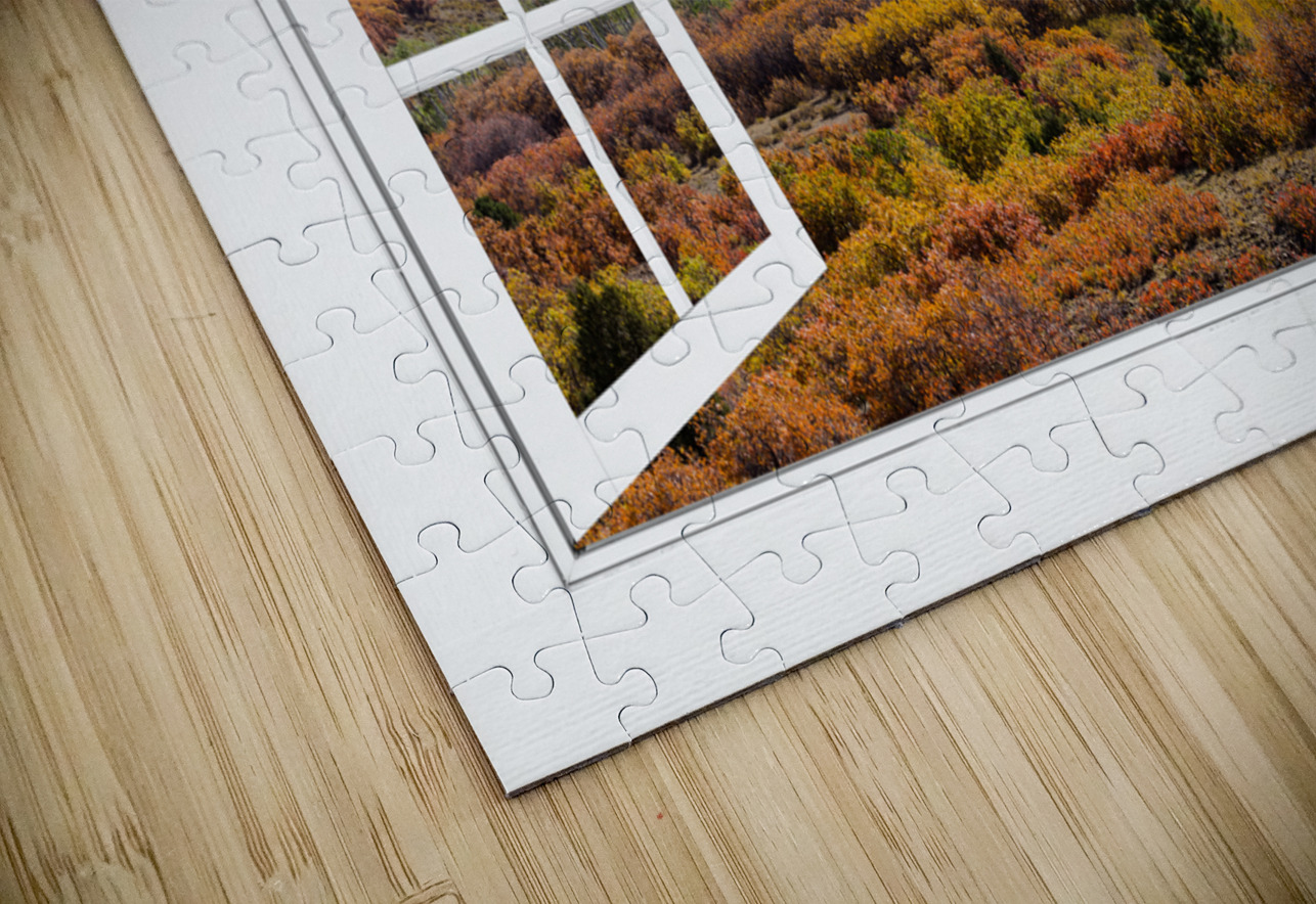 A scenic view of the colorful autumn fall foliage of the Rocky Mountains through an open white picture window frame. A fantasy fine art photography ...[+]