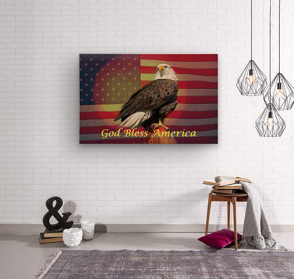 God Bless America. Bald Eagle USA Flag and sun set background. Patriotic fine art print.