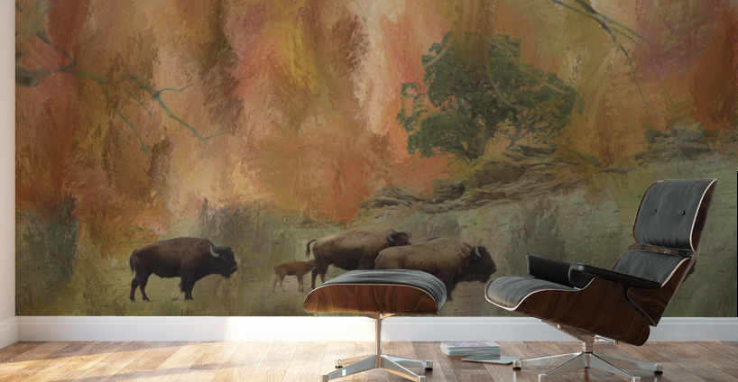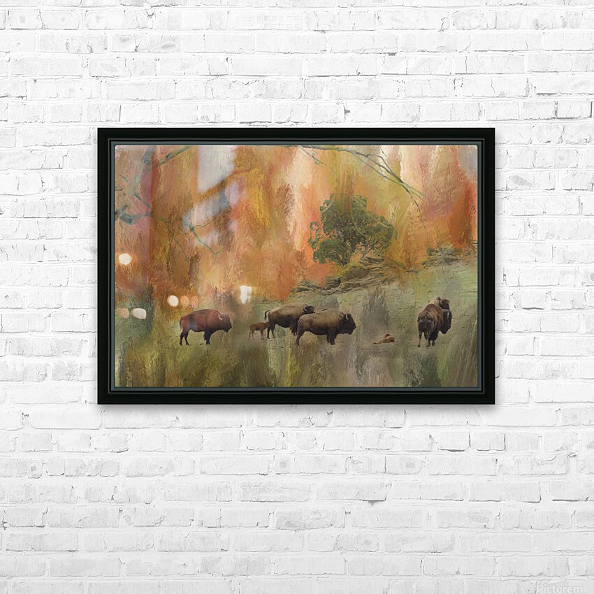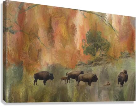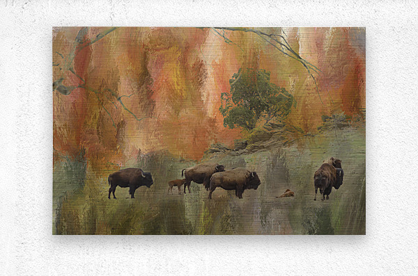 Herd of Bison landscape with mixed media fine art photography. Buffalo art color combination of shades of brown greens gold orange and reds. Accent tones that will liven any décor.
