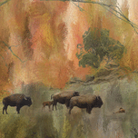 Herd of Bison landscape with mixed media fine art photography. Buffalo art color combination of shades of brown greens gold orange and reds. Accent ...[+]