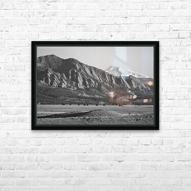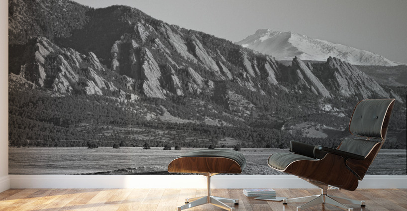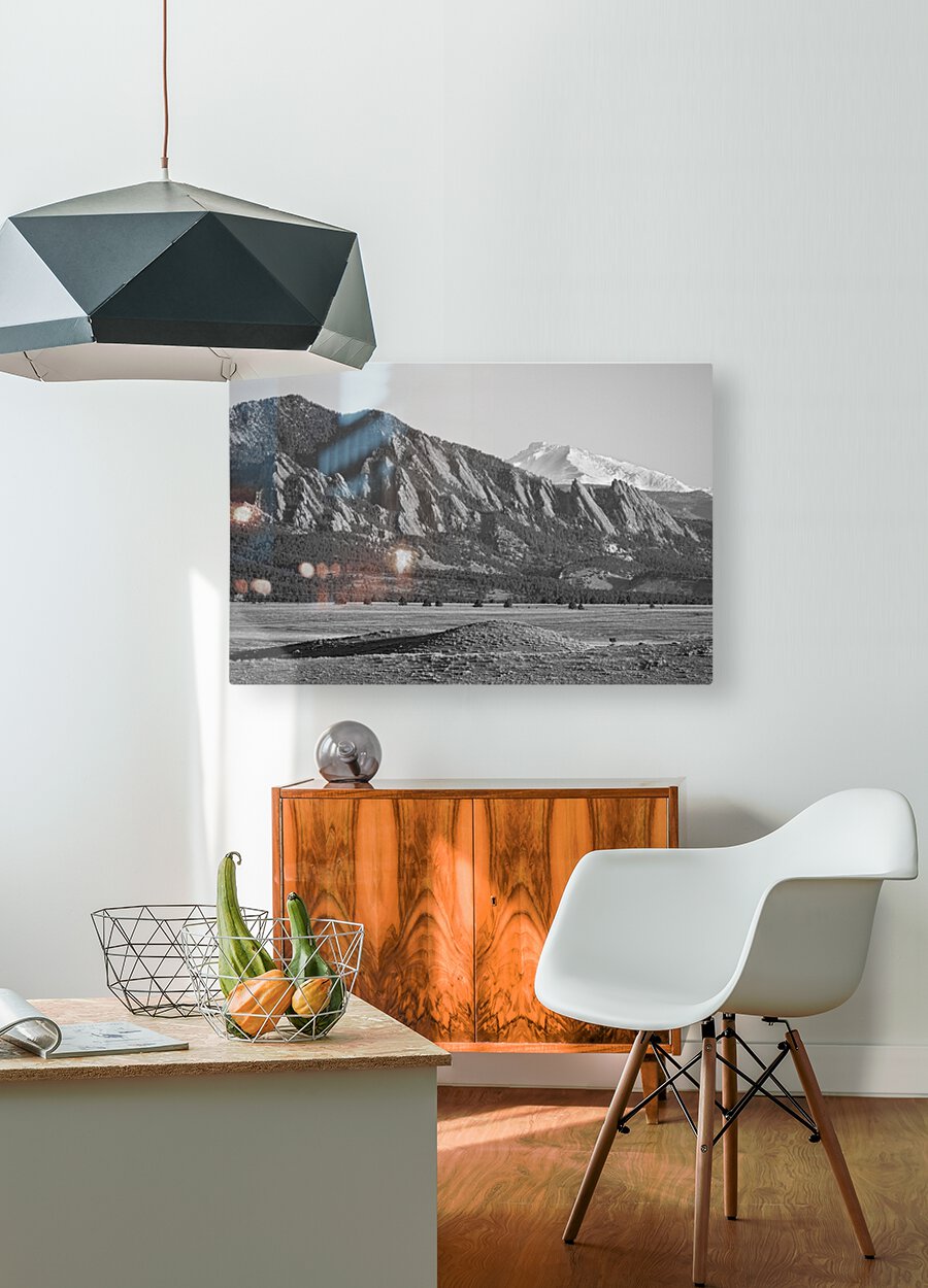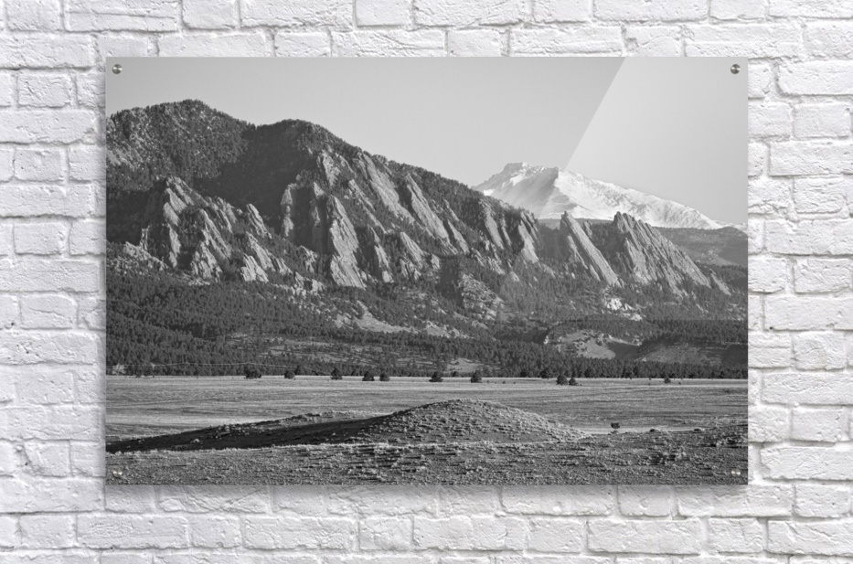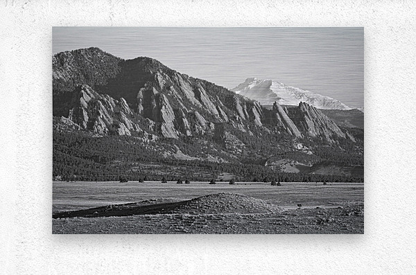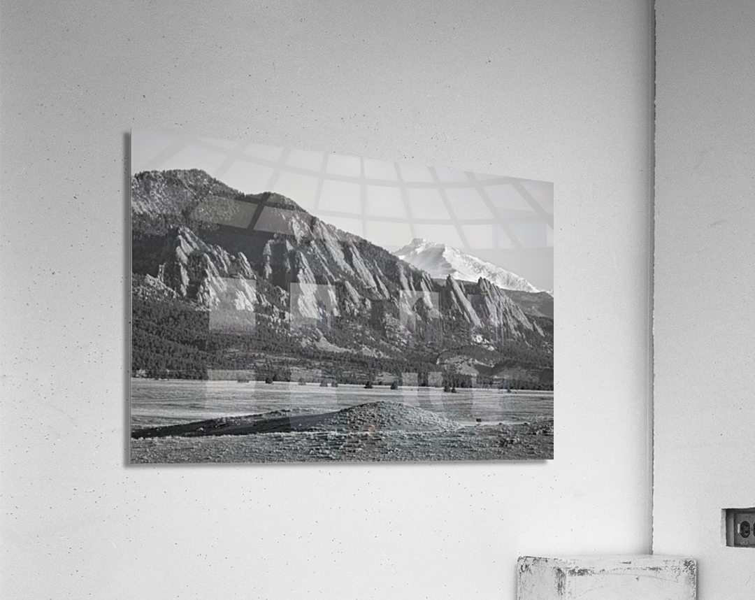 Get this artwork "Colorado Rocky Mountains Flatirons Snow Covered Longs Peak BW" in a framed print.