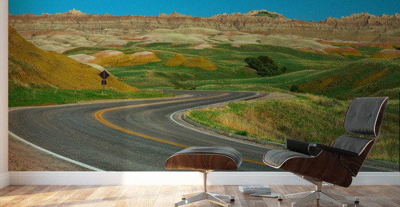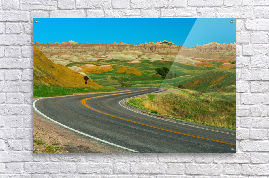 Embark on a visual adventure through this captivating photograph capturing the winding roads that cruise through the vibrant and picturesque hills of the Badlands in South Dakota. As you immerse yourself in the image youll be greeted by a kaleidoscope of colors that adorn the landscape with each turn revealing a new breathtaking vista. The curving pathways perfectly complement the natural contours of the land creating a harmonious dance between human engineering and the captivating beauty of nature. Let your imagination wander as you envision the exhilarating journey along these scenic roads a thrilling exploration of the awe-inspiring Badlands.