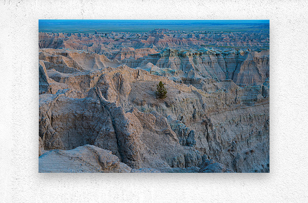 This mesmerizing photography image captures the enigmatic beauty of Badlands National Park in South Dakota showcasing a striking landscape that unveils a labyrinth of buttes canyons pinnacles and spires. Taken during the ethereal blue hour the scene is infused with a serene and mystical ambiance that adds an extra layer of intrigue to this captivating view. The photograph invites viewers to immerse themselves in the intricate maze of rock formations that define the Badlands. Towering buttes rise dramatically from the earth their sharp edges and rugged textures contrasting against the vast expanse of the horizon. The interplay of light and shadow accentuates the sculpted contours of the land creating a captivating visual symphony of depth and dimension. As the blue hour casts its enchanting hue the sky becomes a canvas of soft muted tones. Shades of indigo and violet blend harmoniously providing a breathtaking backdrop that accentuates the otherworldly nature of the scene. The transition from day to night adds an air of mystery and anticipation drawing the viewer deeper into the captivating allure of the Badlands. Within the frame canyons wind their way through the terrain revealing hidden secrets with each twist and turn. Pinnacles and spires reach towards the sky defying gravity and adding a sense of vertical drama to the landscape. This geological masterpiece shaped over millennia by the forces of erosion tells a story of natures artistic prowess and the enduring power of the Earths ever-evolving processes. The striking composition and the play of light and shadows in this photography image truly capture the essence of the Badlands. It serves as a powerful reminder of the ancient forces that have shaped this remarkable landscape and invites viewers to contemplate the intricate beauty found within natures masterpieces. Overall this photograph of the Badlands in South Dakota taken during the captivating blue hour transports viewers to a re