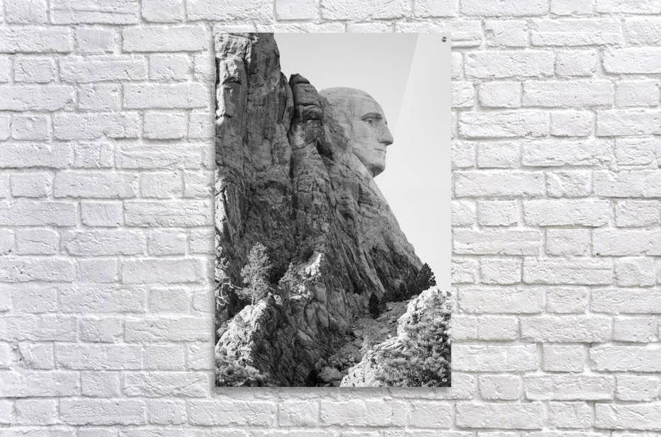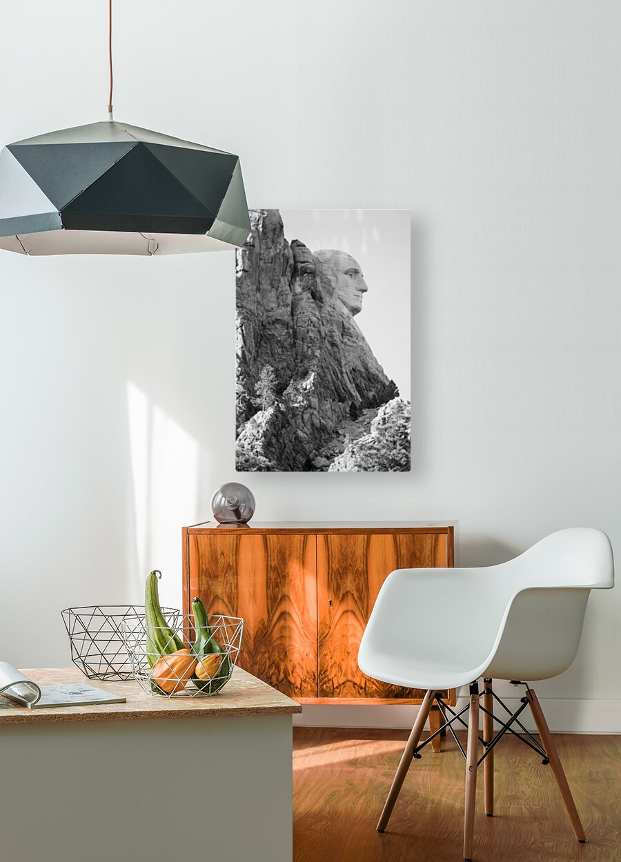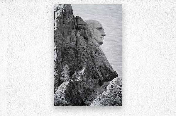This captivating black and white photographic image encapsulates the silent majesty of George Washingtons profile at Mount Rushmore National Monument. The monochromatic presentation adds a timeless and profound aura to the iconic sculpture emphasizing the strength and character of Americas first president. The image captures the impressive detail of Washingtons profile expertly carved into the granite mountainside. Every chiseled line and contour of his face is accentuated highlighting the determination and wisdom etched into his features. His stern gaze and resolute expression evoke a sense of leadership and gravitas that transcends time. The absence of color in the image brings focus to the intricate textures and depth of the sculpture. The play of light and shadow adds a dramatic element enhancing the sculpted contours and emphasizing the rugged nature of the granite canvas on which Washingtons likeness resides. The black and white palette serves to remind viewers of the historical significance and timeless relevance of George Washingtons legacy. It invites contemplation and reflection on the ideals and values that he championed serving as a visual tribute to his unwavering commitment to the nation. This black and white photographic image of George Washingtons profile at Mount Rushmore is a testament to the enduring power of art and the indelible mark left by great leaders. It invites viewers to immerse themselves in the quiet grandeur of the monument and to appreciate the profound impact of Washingtons leadership on the United States. Overall this image captures the silent majesty and historical significance of George Washingtons profile at Mount Rushmore National Monument. It serves as a poignant reminder of the ideals strength and vision that shaped the nation honoring the legacy of one of Americas most esteemed leaders.