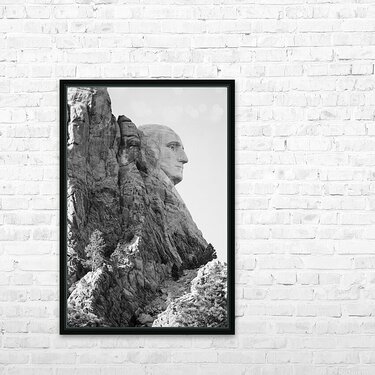 This captivating black and white photographic image encapsulates the silent majesty of George Washingtons profile at Mount Rushmore National Monument....[+]