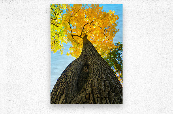 Autumns Majestic Ascent. In this captivating photograph the viewers perspective is directed skyward tracing the majestic journey of a towering tree. The gnarled and textured bark of the trees imposing trunk dominates the foreground showcasing the scars and crevices earned through years of resilience. As your gaze ascends the bark gradually gives way to a magnificent spectacle of natures artistry: a canopy of resplendent golden leaves shimmering like molten amber in the gentle embrace of the autumn sun. This image captures the essence of falls transformation as the trees long trunk serves as a stoic anchor for the vibrant tapestry of leaves that adorn its lofty crown.