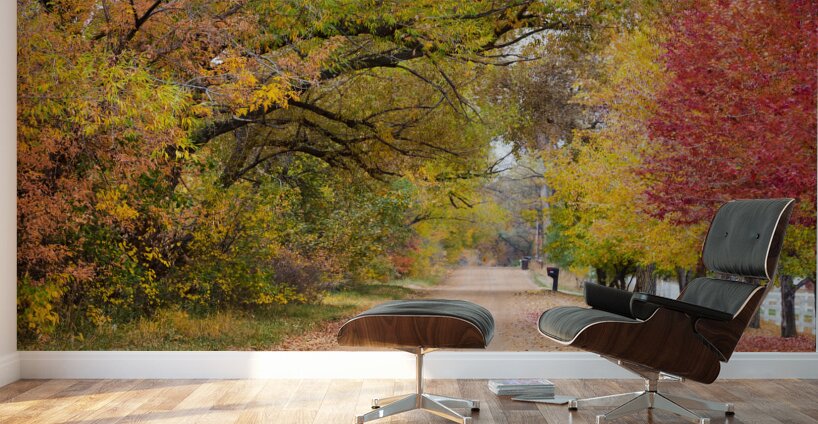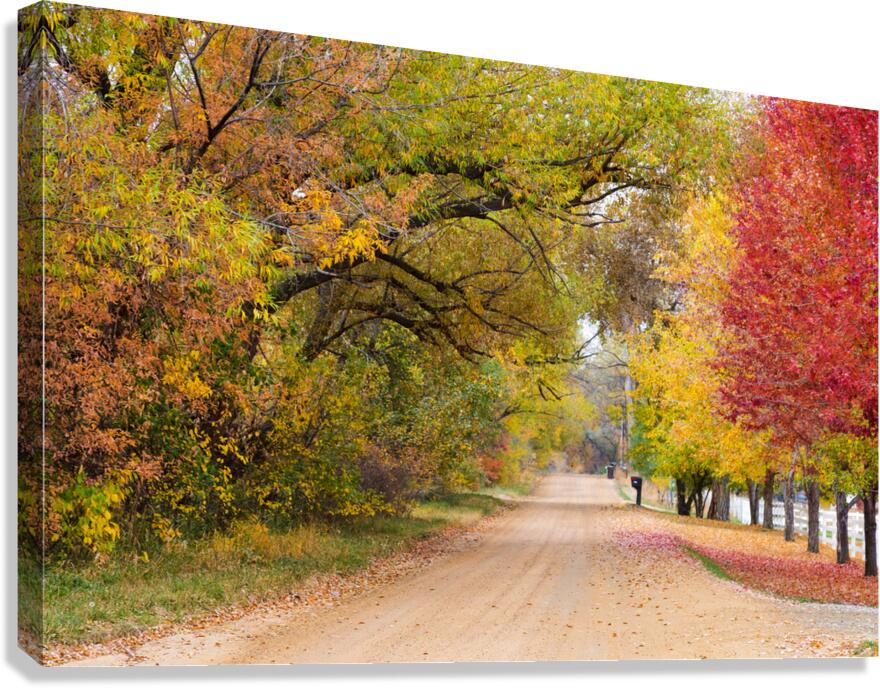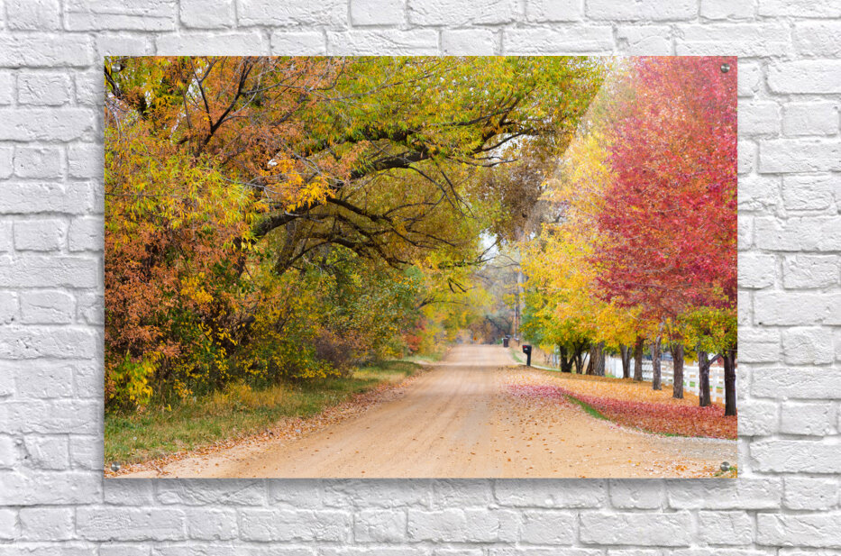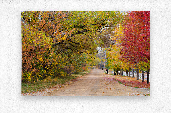 In Autumns Country Retreat a captivating photography image transports you to the heart of a rustic country landscape ablaze with the vibrant hues of fall. This idyllic scene is a symphony of natures palette a charming ode to the changing of seasons. The focal point of the image is a quaint country dirt road that makes its way through the scene. This road beckons you to embark on an enchanting journey through the heart of autumns splendor. Its as if the very earth itself is a canvas for the seasons brilliance. Overarching the road a magnificent canopy of trees graces the landscape their branches adorned in a rich tapestry of colors. Brilliant shades of red orange and gold intertwine with the lingering remnants of deep green leaves creating a breathtaking mosaic above. The country road seems to disappear into this living tunnel of foliage evoking a sense of adventure and wonder. Each step forward promises to reveal a new vista a fresh burst of color or a hidden treasure underfoot. The surrounding trees create a natural archway their branches reaching out as if to embrace all who wander beneath. The image is a visual reminder of the gentle transition from summer to winter where natures transformation is displayed in its full glory. The colors of autumn hold sway and the beauty of this serene countryside as captured in this photograph invites you to immerse yourself in its tranquil charm if only for a moment. Autumns Country Retreat is an exquisite representation of the countrysides ability to evoke peace and enchantment reminding us of the simple yet profound pleasures found in the changing seasons and the breathtaking spectacle of autumns fall foliage.