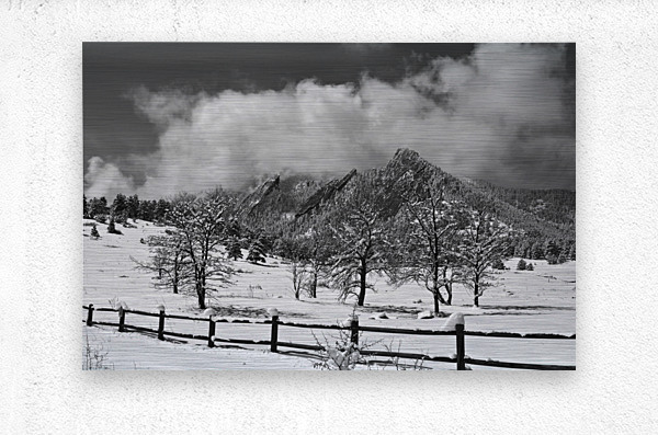 ABOUT THIS ARTWORK: BOULDER COLORADO SNOWY FLATIRONS LANDSCAPE BLACK AND WHITE