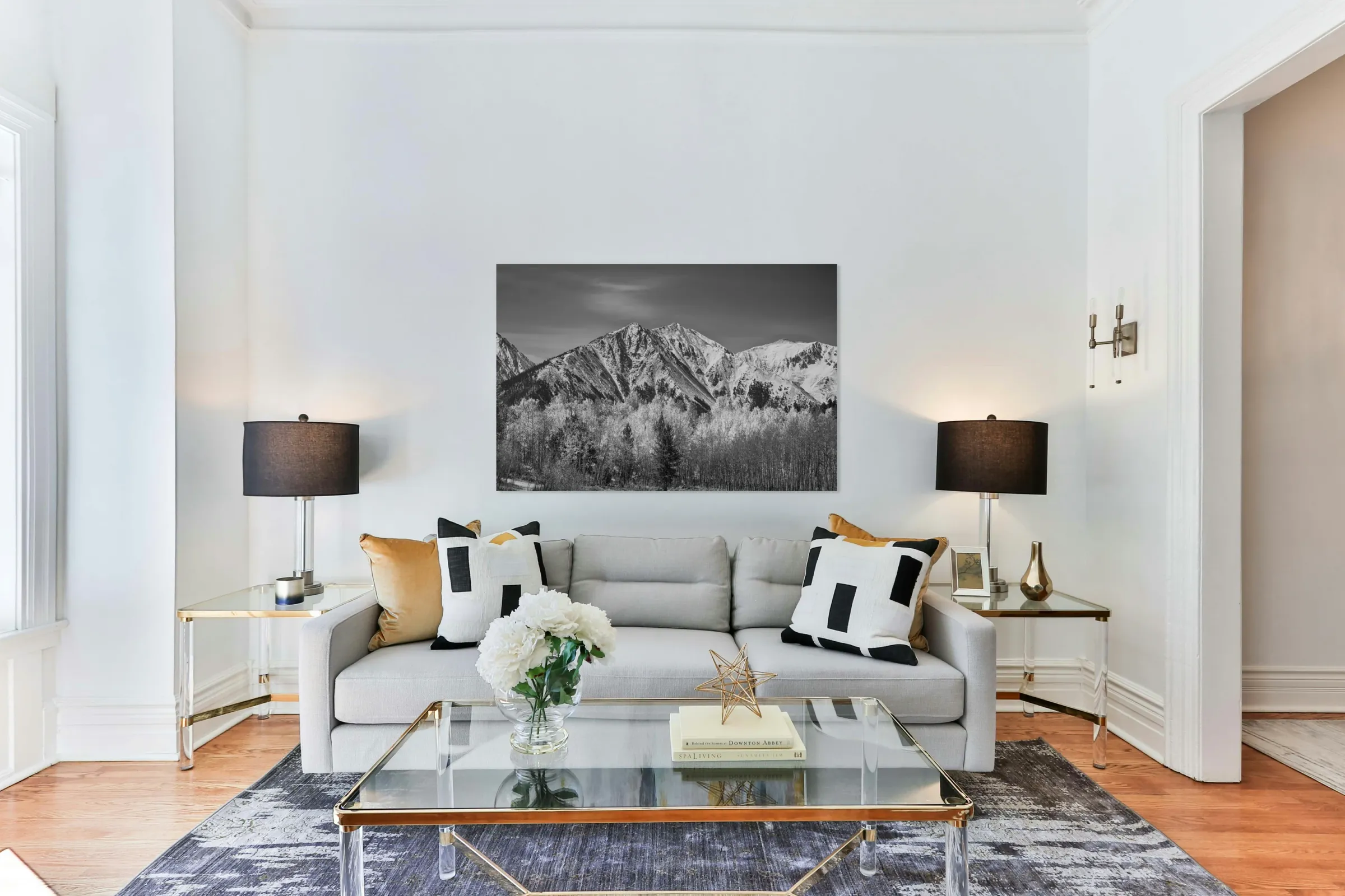 A scenic autumn landscape in the high country of the Colorado Rocky Mountains with autumn aspen trees and majestic snow dusted mountain peaks. Twin Lakes area Lake County Colorado. Black and white version. Colorado Fine art nature landscape photography poster prints decorative canvas prints acrylic prints metal prints corporate artwork greeting cards and stock images by James Bo Insogna C - All Rights Reserved. *PLEASE NOTE WATERMARKS WILL NOT BE ON THE PURCHASE PRINTS*