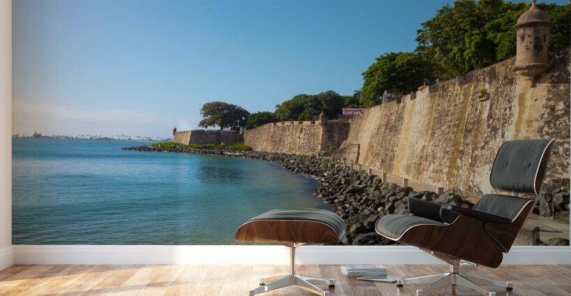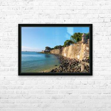 This captivating photograph captures the essence of San Juan Puerto Rico as the viewer gazes out towards the vast sea. The image encompasses a panoramic view featuring sturdy walls that bear witness to the citys rich history. These weathered walls adorned with centuries-old textures stand as silent guardians along the coastline. Amidst the historic fortifications ancient guard towers rise majestically strategically positioned to oversee the rhythmic ebb and flow of the sea. The architectural details of the towers highlighted against the backdrop of the deep blue waters create a sense of timeless resilience and maritime grandeur. The expansive view extends to the horizon inviting contemplation of the meeting point between the old world and the boundless sea. The photograph encapsulates the unique blend of historical significance and natural beauty that defines San Juan a city where the fortified walls and watchtowers stand as testaments to centuries of maritime history and cultural richness.