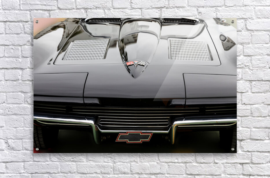 The sleek and timeless design of a 1965 Chevy Corvette takes center stage in a mesmerizing close-up. The lustrous black exterior enhances the classic allure of this iconic car while the curves and contours of the hood and front-end evoke a sense of vintage elegance. The meticulous craftsmanship of the Chevy Corvette is evident in every detail from the iconic dual headlights to the distinct grille and emblem. The play of light on the polished surface accentuates the cars dynamic lines showcasing the enduring beauty of this classic model. This close-up view invites the viewer to appreciate the artistry and engineering of the 1965 Chevy Corvette a symbol of automotive excellence. Whether youre a car enthusiast or an admirer of vintage elegance this photograph captures the spirit of a bygone era where craftsmanship and style converged to create a timeless classic.