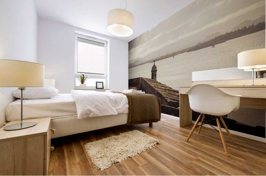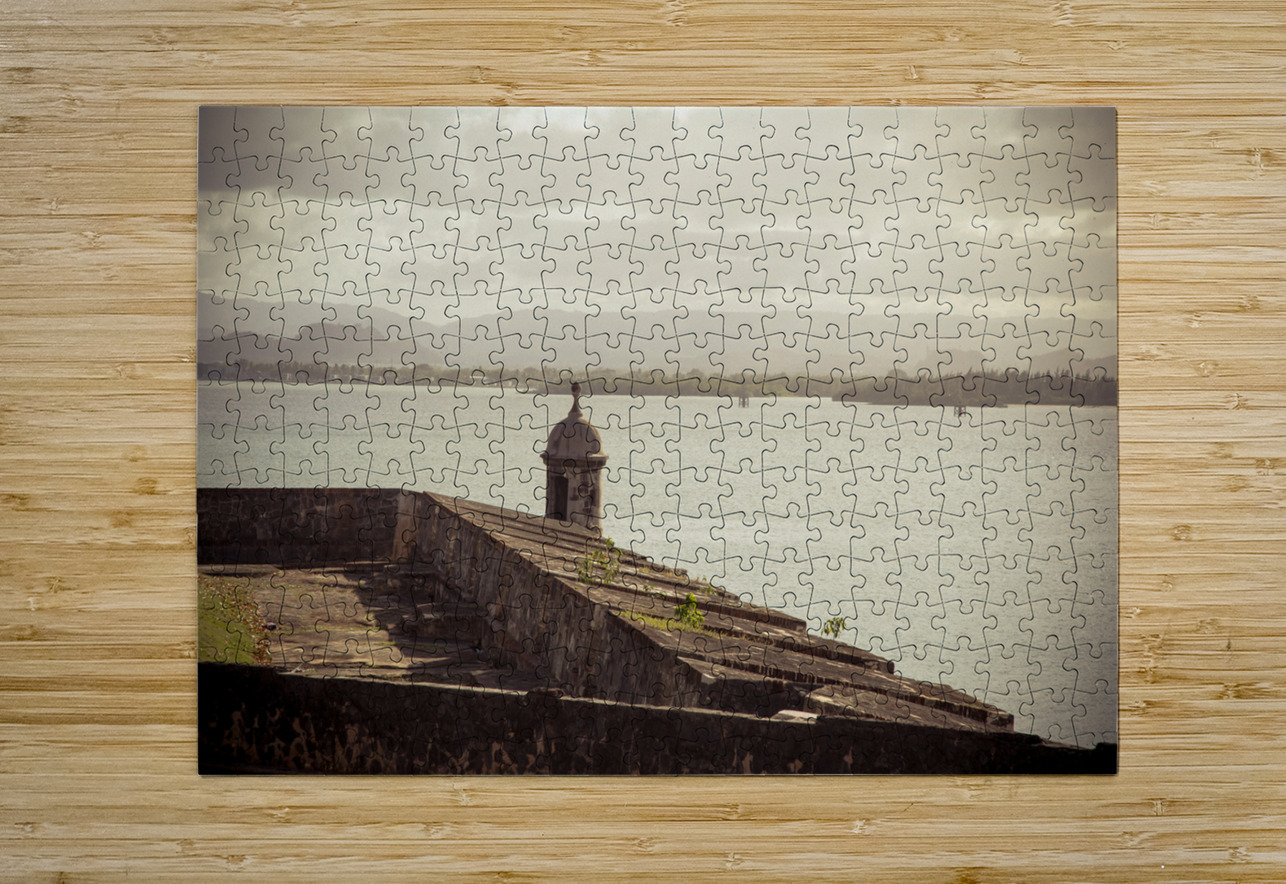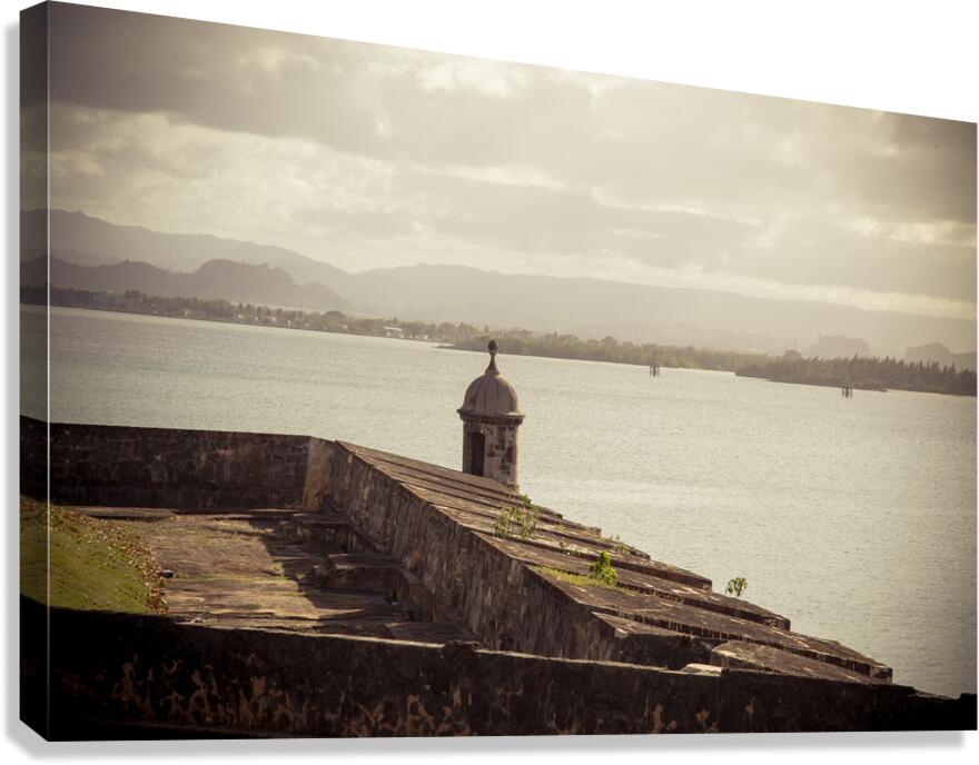 The allure of Puerto Rico unfolds in a rustic landscape view featuring the textured surface of the historic wall in Old San Juan. The image immerses the viewer in the rich details of the weathered wall each groove and imperfection telling a tale of the islands storied past. A commanding guard tower stands sentinel casting its silhouette against the serene waters of the bay. The textured wall a testament to the enduring spirit of Puerto Rico adds a layer of depth to the composition. The guard tower standing with historical significance overlooks the tranquil bay creating a harmonious blend of architectural heritage and natural beauty. The overall scene is infused with a timeless quality inviting contemplation and appreciation for the cultural richness embedded in Puerto Ricos landscapes. This fine art photograph captures the poetic fusion of texture history and coastal charm offering a visual journey into the heart of Puerto Ricos architectural legacy. It is a celebration of the islands enduring resilience and the enchanting interplay between historical elements and the scenic beauty of the bay.