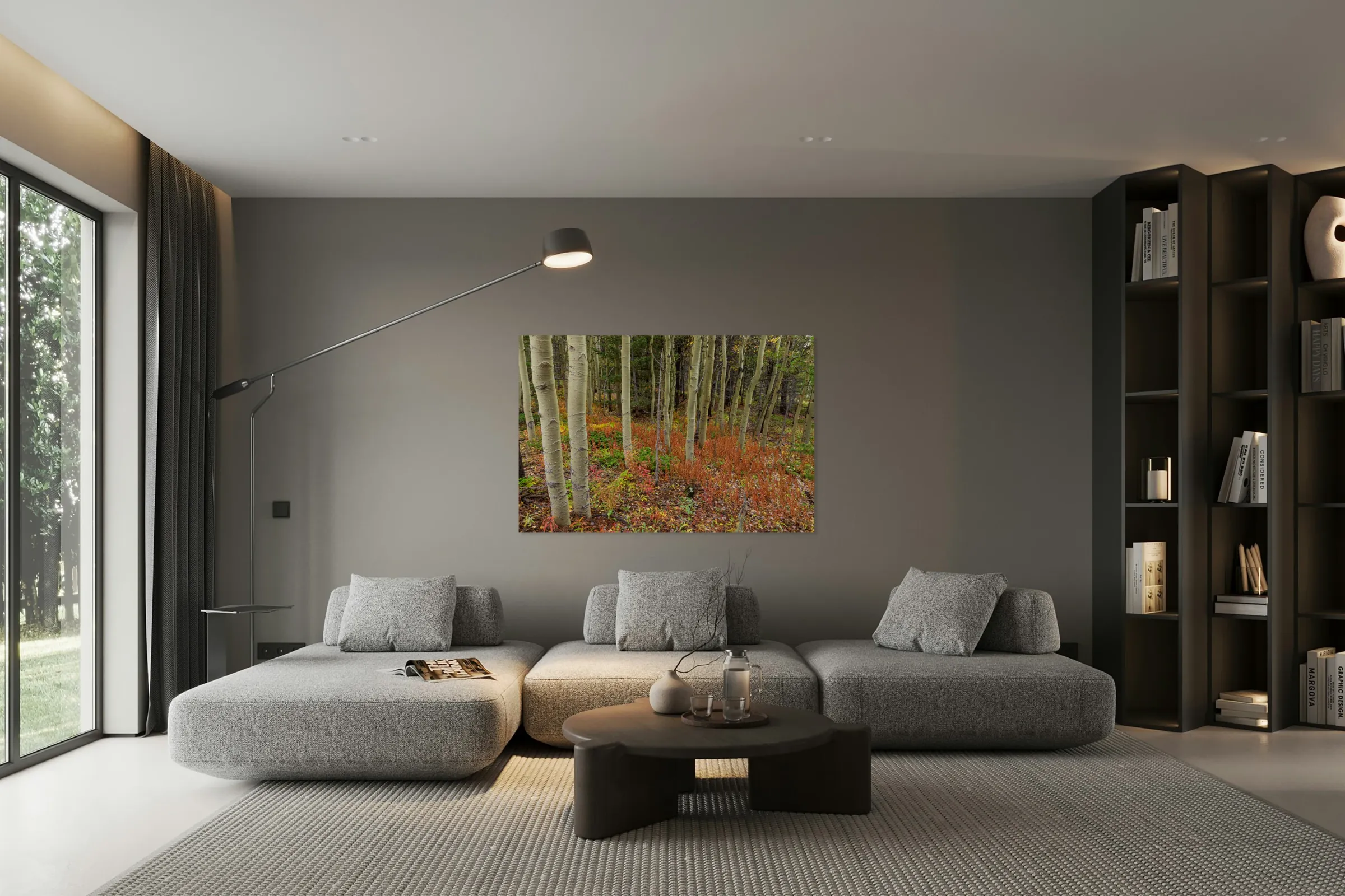 A peak into a wilderness wonderland with a colorful forest floor and the tree trunks of Colorado Aspen trees. Photo: © James Bo Insogna
