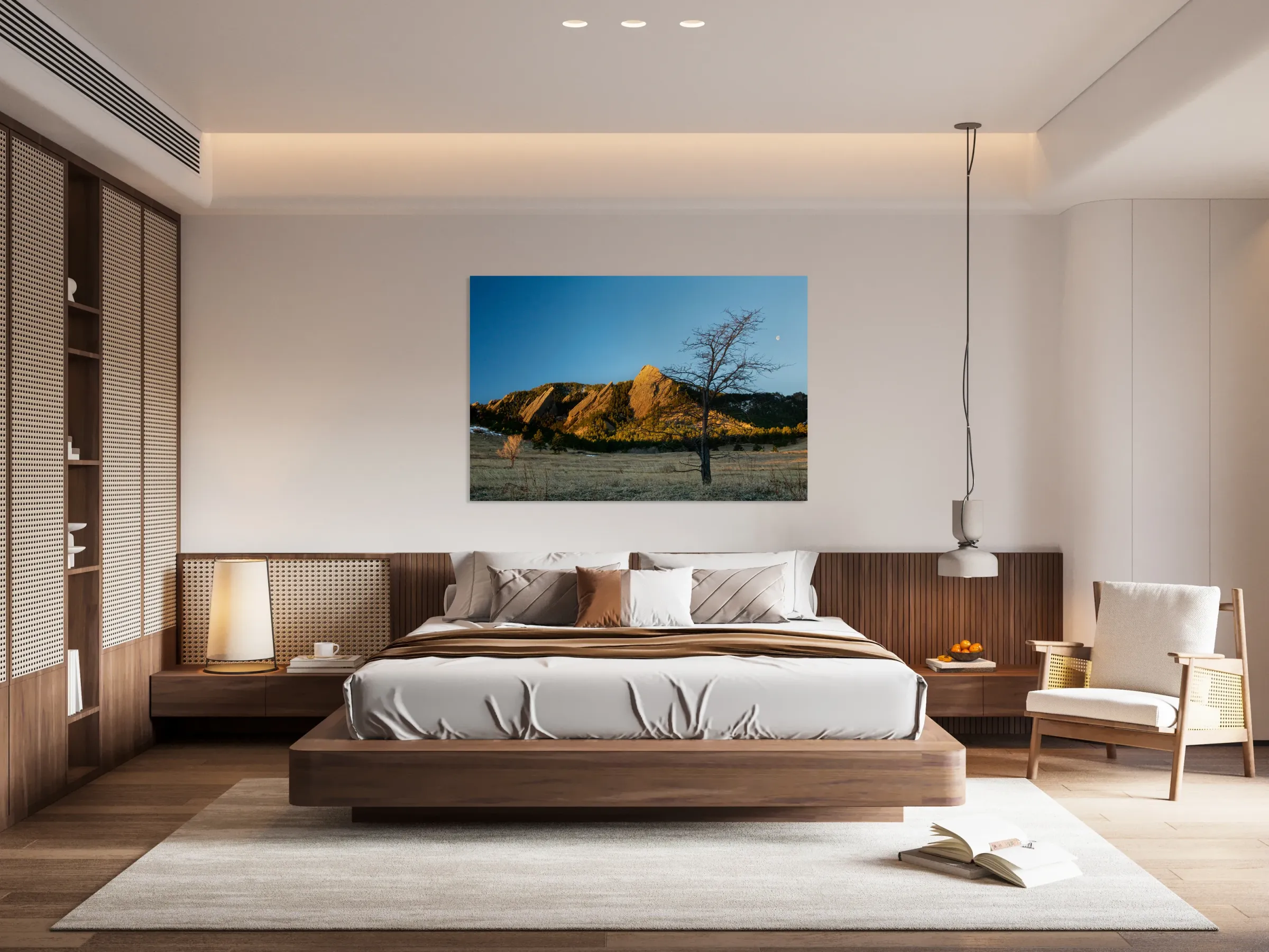 Scenic landscape view of the Flatirons on the front range in Boulder Colorado as the sun is rising and the waning gibbous moon is setting behind the Colorado Rocky Mountains. Colorado fine art nature landscape photography poster prints decorative canvas prints acrylic prints metal prints corporate artwork greeting cards and stock images by James Bo Insogna C - All Rights Reserved. Please feel Free to share our links with Family or Friends who may also enjoy them. If you like my Art Gallery please spread the word and press the Pinterest FB Google+ Twitter or SU Buttons! Thank you! *PLEASE NOTE WATERMARKS WILL NOT BE ON THE PURCHASE PRINTS*