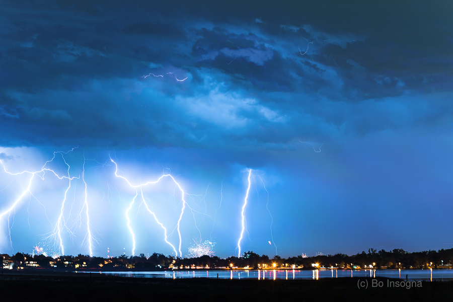 This is a timed stack of 57 images taken on the fourth of July with a view to the south towards from Longmont north side of McIntosh Lake Boulder County Colorado. Nature kept the party going till well after midnight.
