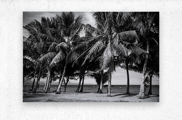 A row of palm trees lining a Negros Oriental Island sandy beach creating a scene of stark beauty. The image is composed with a focus on texture and contrast emphasizing the fronds of the palm trees against a cloudy sky. The trees are captured in varying shades of gray their silhouettes standing out against the lighter background. The sandy beach in the foreground provides a sense of depth and perspective while the suggestion of a distant shoreline adds a touch of mystery. The overall effect is one of quiet drama highlighting the natural beauty of the tropical landscape through the lens of monochrome photography.