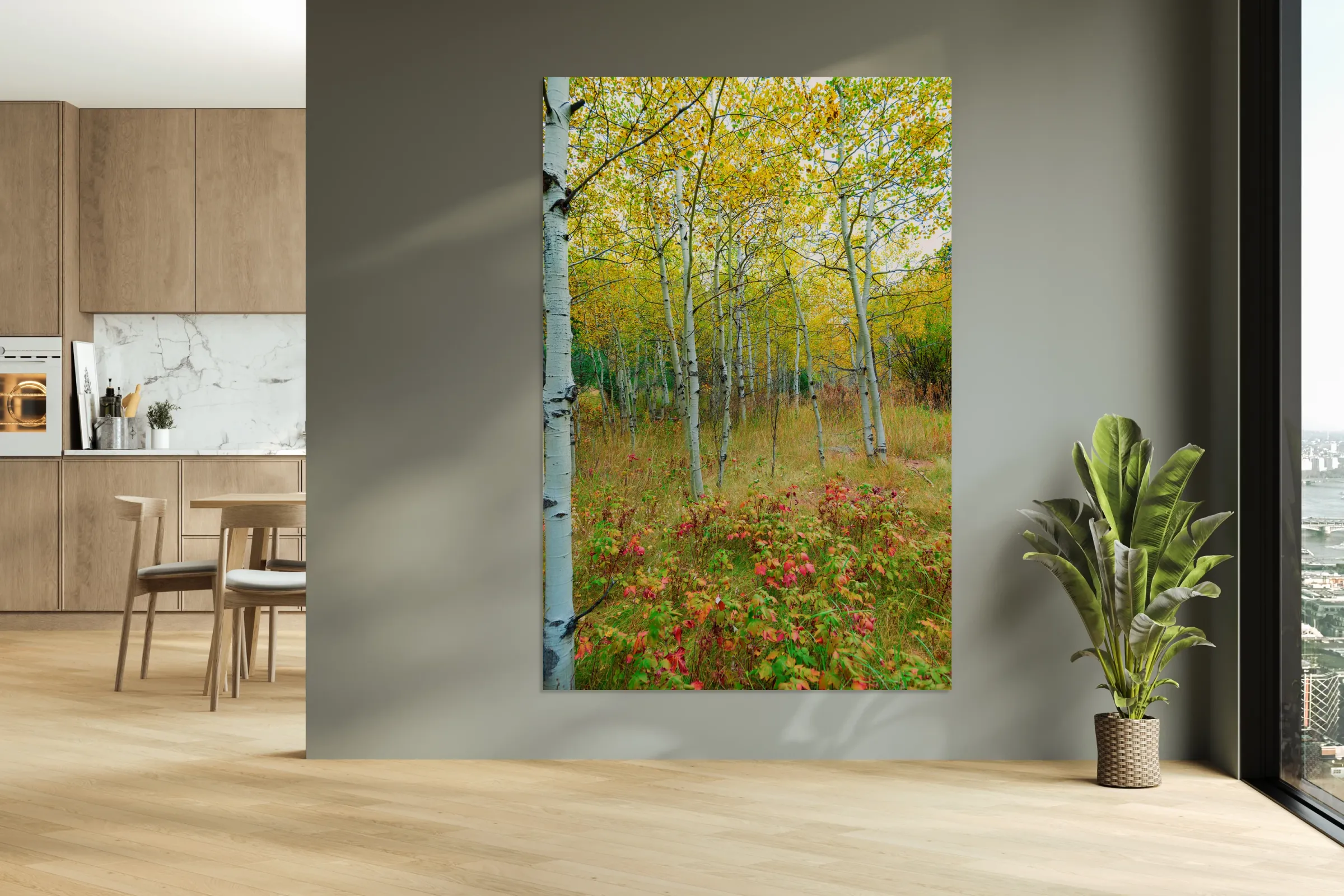 A breathtaking fine art photograph capturing a vibrant aspen grove in the peak of fall. This image features the classic white trunks of the trees set against a brilliant canopy of golden leaves. The forest floor is a stunning mix of grasses and bushes ablaze with fiery red and orange foliage creating a dynamic and colorful scene. This piece beautifully encapsulates the essence of the autumn season making it a perfect addition to any space seeking a touch of natural beauty and serene energy.