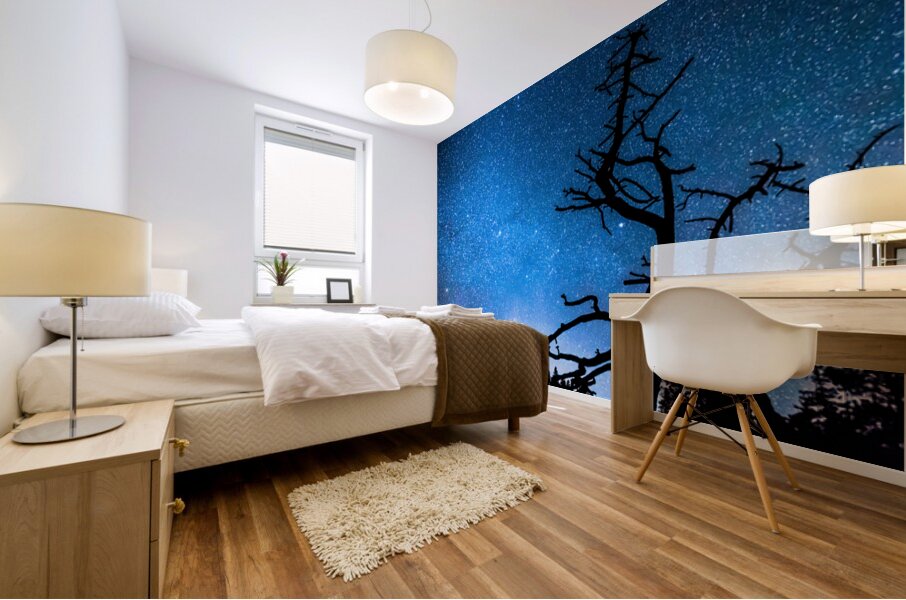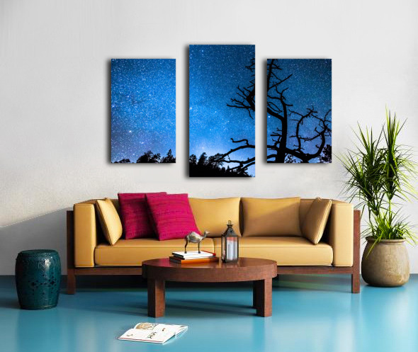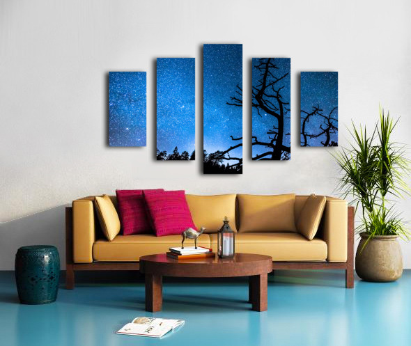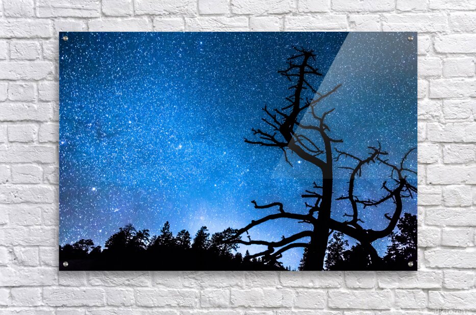The image captures the majestic night sky over Bryce Canyon a certified International Dark Sky Park. A prominent silhouette of a gnarled solitary tree stands against a vibrant star-filled firmament showcasing the ethereal beauty of astrophotography. The deep blue tones of the heavens speckled with countless stars and the faint glow of the Milky Way provide a stunning contrast to the dark terrestrial foreground. This fine art photograph embodies the serene and untouched nature of Utahs unique landscape after sunset making it a perfect piece for home or office decor.