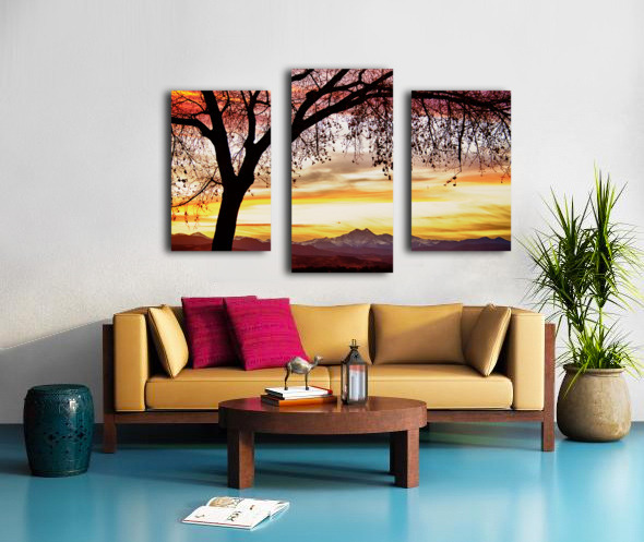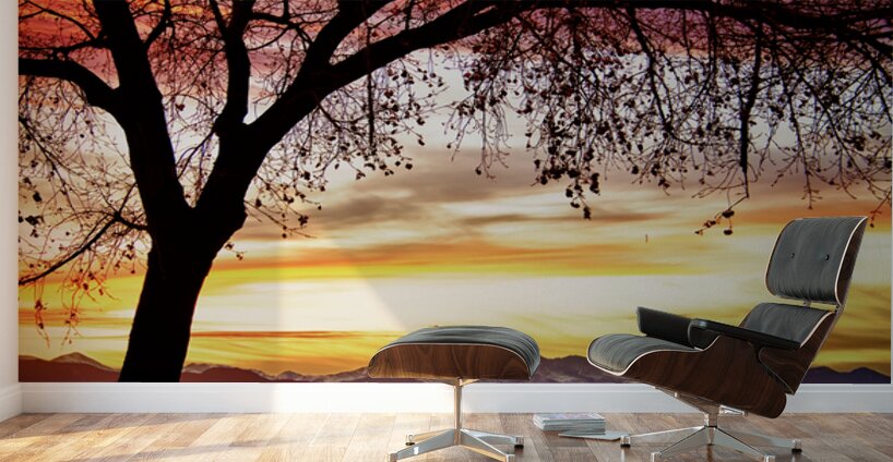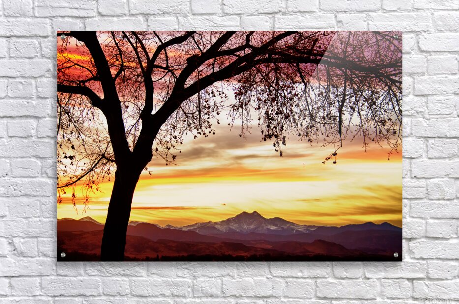 A breathtaking fine art photography print capturing a vivid sunset sky over the Colorado Front Range. Framed by the silhouette of a large tree the scene reveals the iconic Twin Peaks Mount Meeker at 13911 feet and Longs Peak at 14256 feet rising majestically above Boulder County. Perfect as wall art this image blends nature?s drama with timeless mountain beauty.