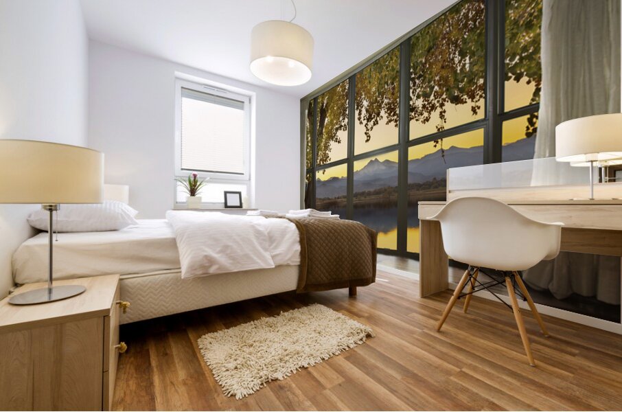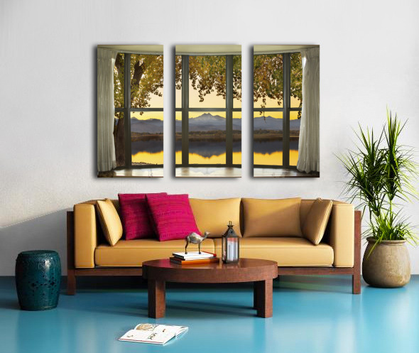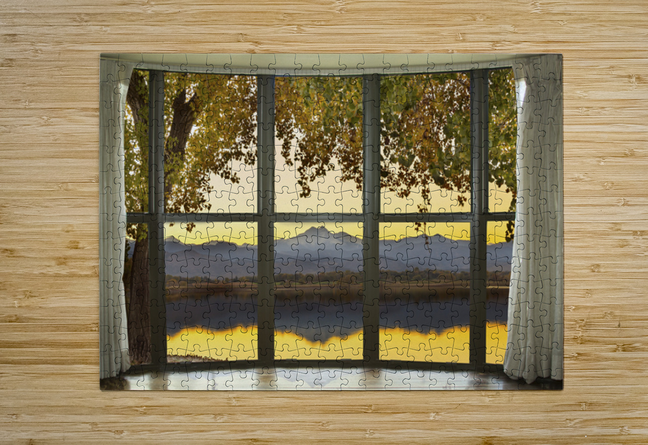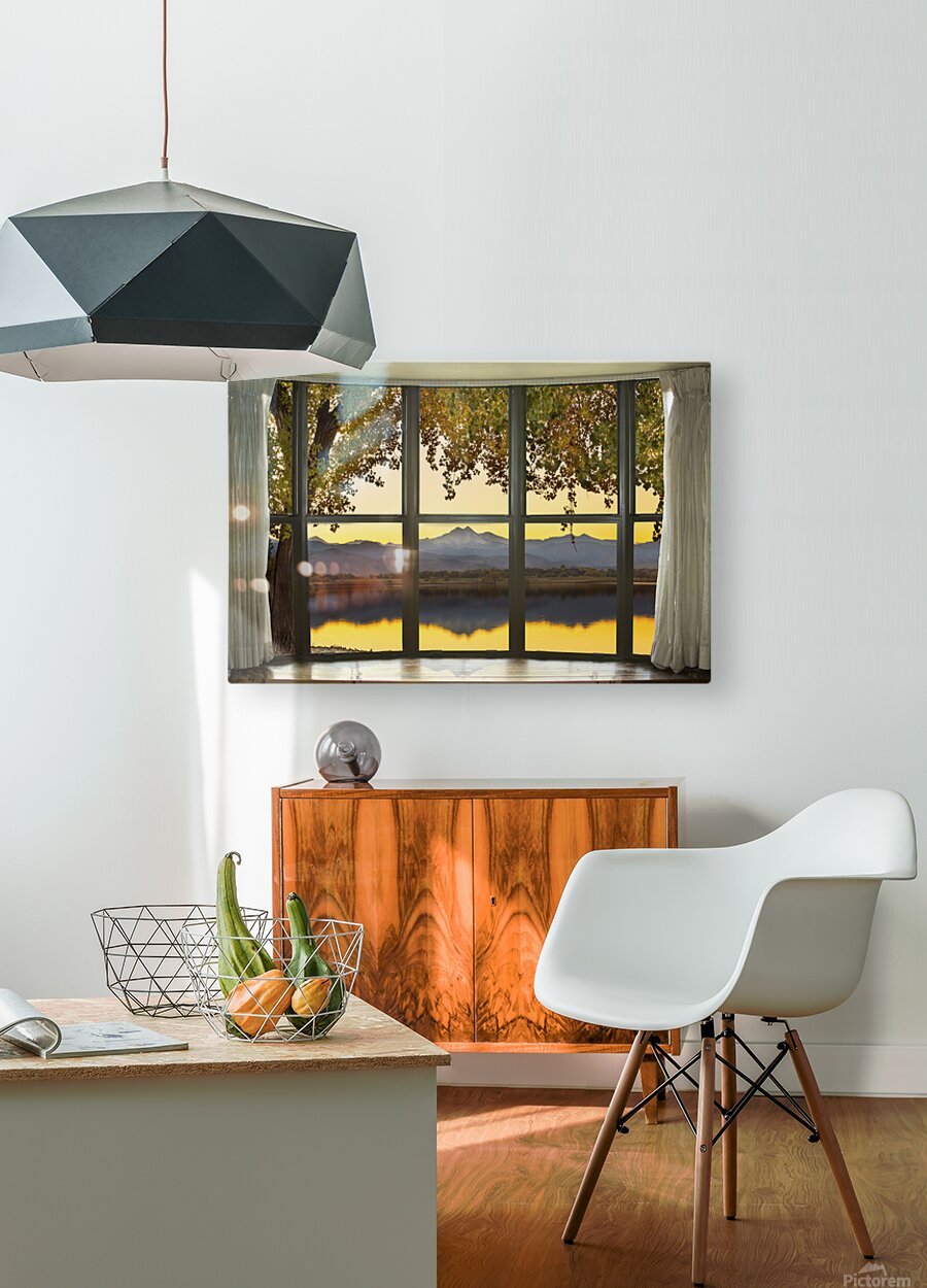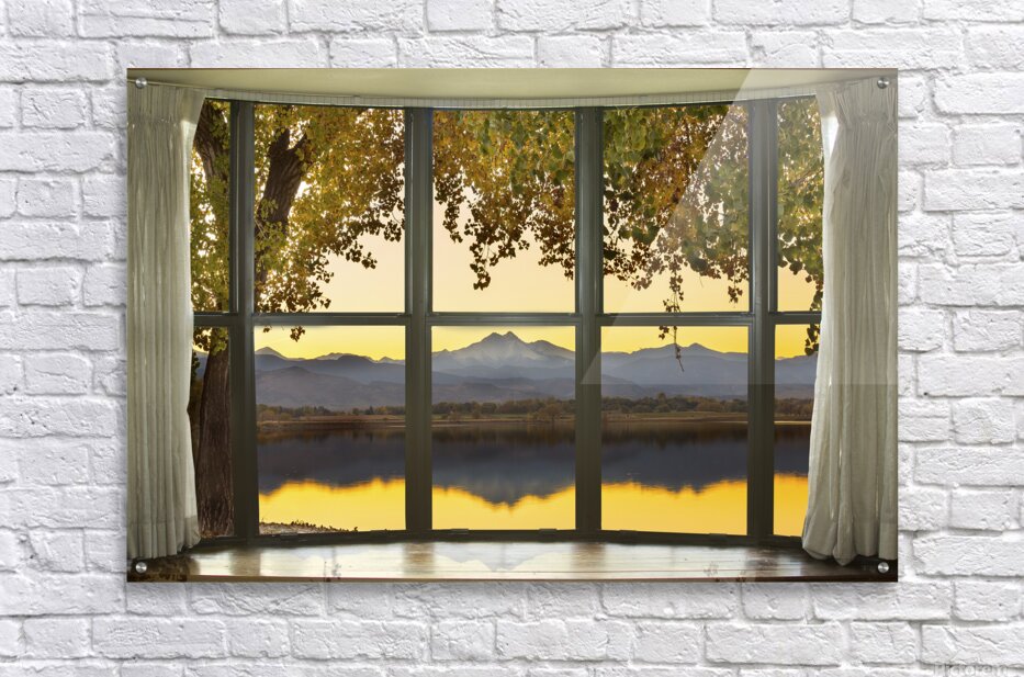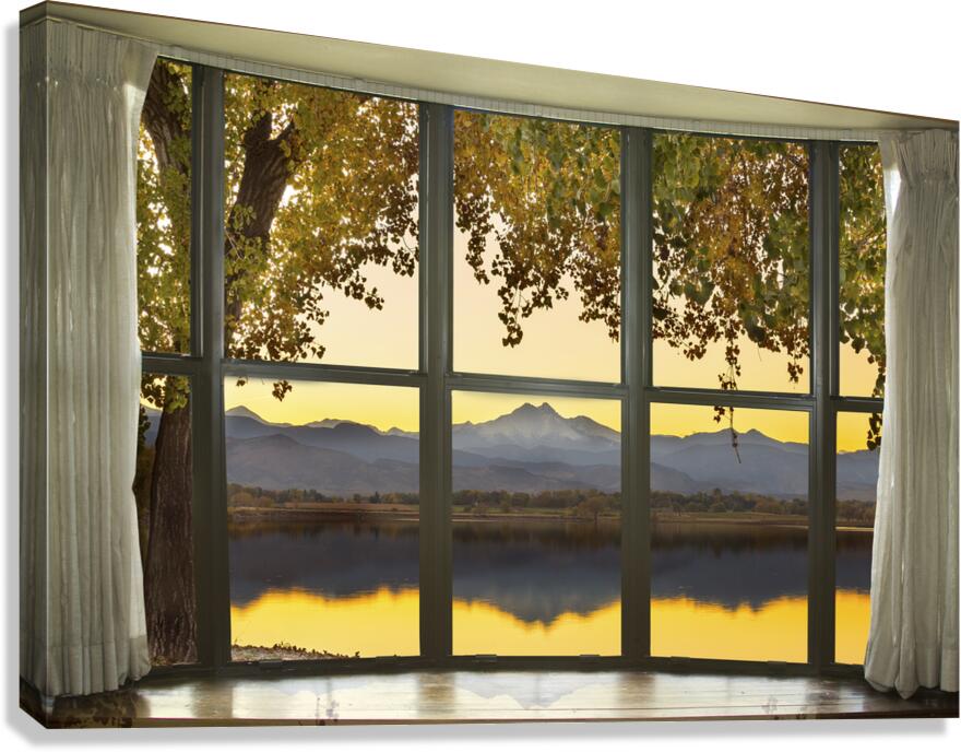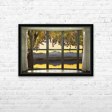 A serene fine art window-view composition framing golden autumn trees still water reflections and distant mountain peaks beneath a warm sunset sky. This elegant landscape photograph creates a sense of calm balance and depth making it a refined wall art piece for modern interiors luxury home d?cor gallery walls and curated nature art collections. Scenic landscape autumn season view of a large cottonwood tree golden sunset and the Colorado Rocky Mountains Twin Peaks Mt Meeker 13911 feet and Longs Peak 14.256 feet with peaceful water reflections. Bring nature indoors now you can add a bay window with a view to any room in your home or office with our picture window frame tm fine art striking photography nature landscape art prints. The IMAGE is the FRAME how cool is that! Create a fine art photography optical illusion of a beautiful bay window view. PLEASE NOTE : The Window Frame is part of the image. This is a composite fine art work. We recommend printing as frame-less acrylic print metal print or canvas wrap with black sides . Question: Do you have a home or office room without any windows? Do you want to set the mood in a room decor? Do you dream of a room with a view? The Answer: Now you can have a window with a view in any room with our NEW picture window frame fine art striking photography nature landscape poster prints canvas wraps acrylic fine art prints and metal prints... all with a view and ready to hang by photographer James Bo Insogna. This is an incredible way to decorate your office walls home walls cafe health clinic restaurant boardroom waiting room trade booth corporation or almost any commercial space. Colorado fine art nature landscape photography images by James Bo Insogna C - All Rights Reserved. If you are interested in licensing this image please hit the contact us for a custom quote. *PLEASE NOTE WATERMARKS WILL NOT BE ON THE PURCHASE PRINTS*