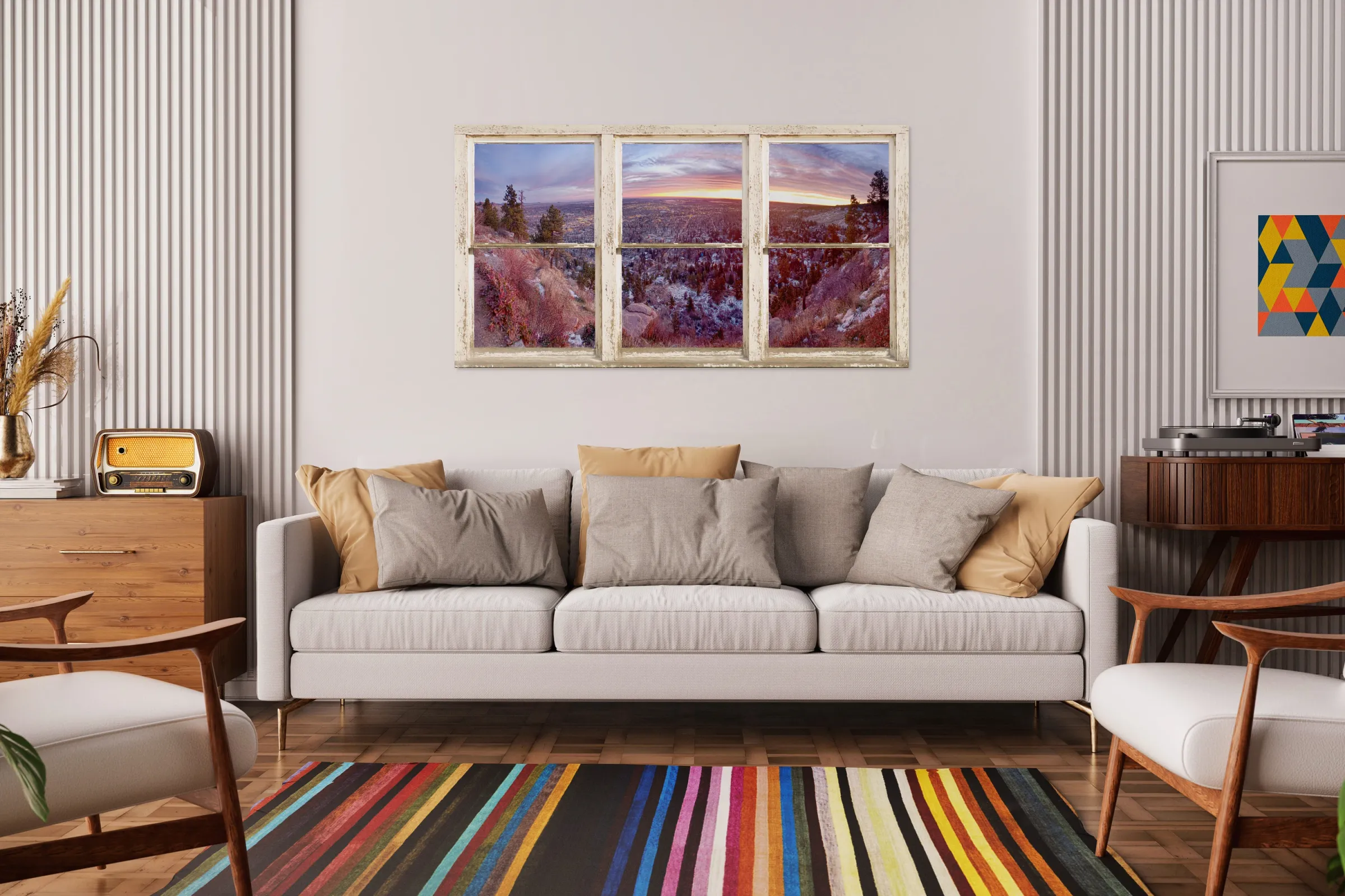 A scenic view out an old rustic distressed white window from the mountains to the city below and colorful morning sky. Your very own private mountain city rustic window view. Create a fine art photography optical illusion to your decor of a beautiful stormy night sky with a view through an aged distressed rustic barn farmhouse window. Bring nature indoors now you can add a window with a view to any room in your home or office with our picture window frame nature landscape art prints. The IMAGE is the FRAME how cool is that! Do you have a home or office room without any windows? Do you want to set the mood in a room decor? Do you dream of a room with a view? Now you can have a window with a view in any room with our picture window frame fine art striking photography nature landscape prints all with a view and ready to hang. This is an incredible way to decorate your window less office walls home walls cafe restaurant boardroom waiting room trade booth corporation or almost any commercial space. **PLEASE NOTE WATERMARKS WILL NOT BE