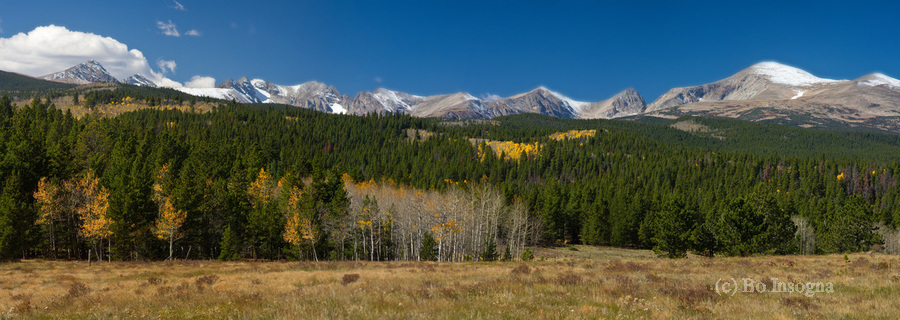 A scenic panorama view of the Indian Peaks in the Autumn season as the last of the Aspen trees torn to their colors. This is a very large image seven portrait images put together. On a very windy day right before a big storm and the first blue sky I have gotten all season in the high country. Fine art Colorado nature landscape photography prints decorative canvas prints acrylic prints metal prints greeting cards and stock images by By James Bo Insogna C - All Rights Reserved. 303-834-2524 *PLEASE NOTE WATERMARKS WILL NOT BE ON THE PURCHASE PRINTS*