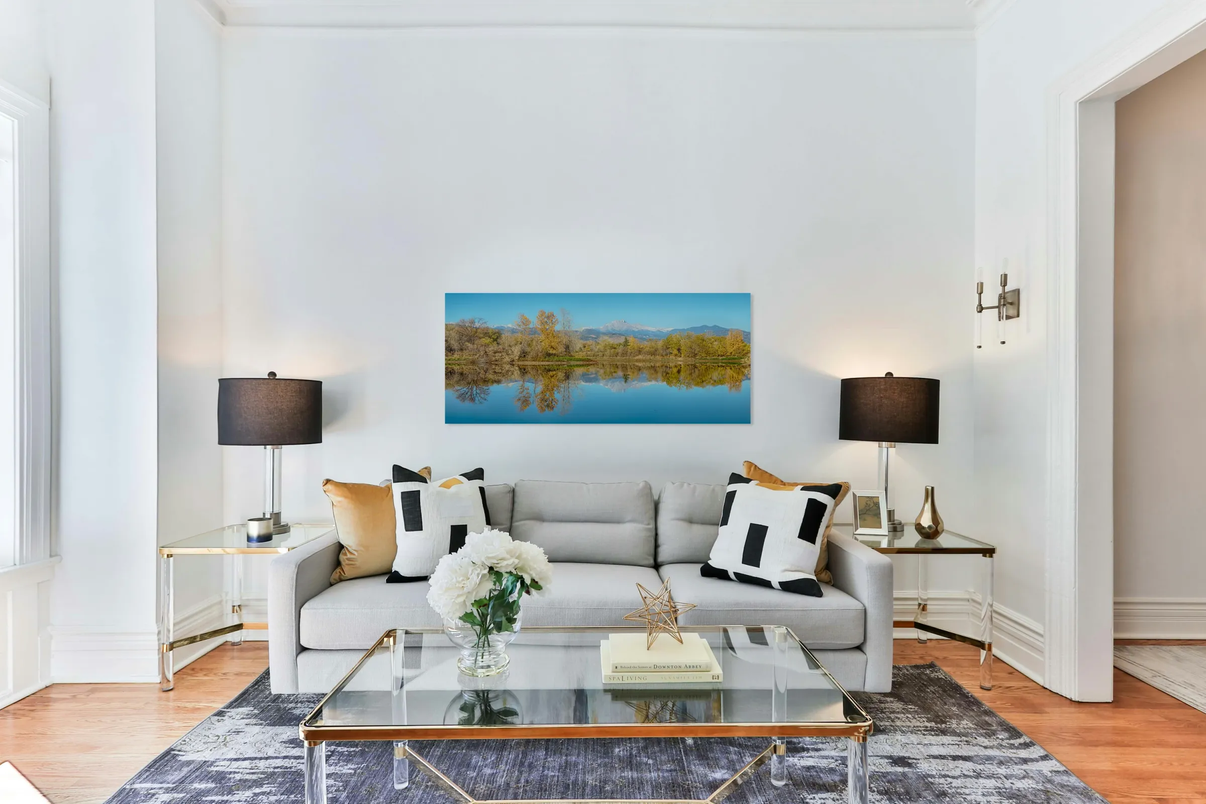 All photographer love days that are very calm with no wind and water turns to glass. That was the case this morning when I shot this image with clear blue skies over head. Scenic autumn season view of the twin Peaks Mt meeker 13911 ft and Longs Peak 14256 ft with mirror like reflections from Golden Ponds in Longmont Colorado Boulder County. Panorama version. Colorado fine art nature landscape photography poster prints decorative canvas prints acrylic prints metal prints corporate artwork greeting cards and stock images by James Bo Insogna C - All Rights Reserved. Please feel Free to share our links with Family or Friends who may also enjoy them. If you like my Art Gallery please spread the word and press the Pinterest FB Google+ Twitter or SU Buttons! Thank you! *PLEASE NOTE WATERMARKS WILL NOT BE ON THE PURCHASE PRINTS*