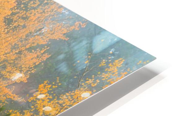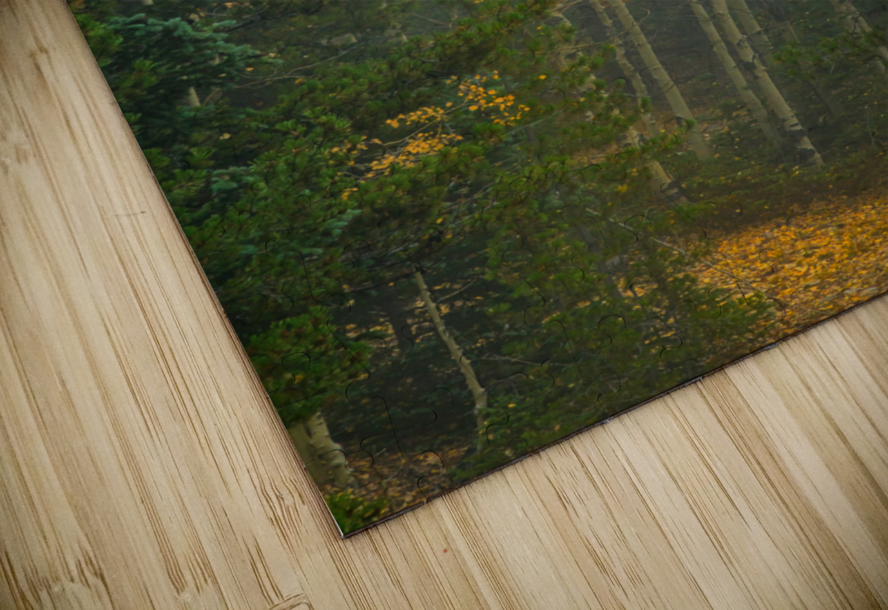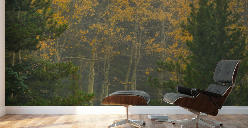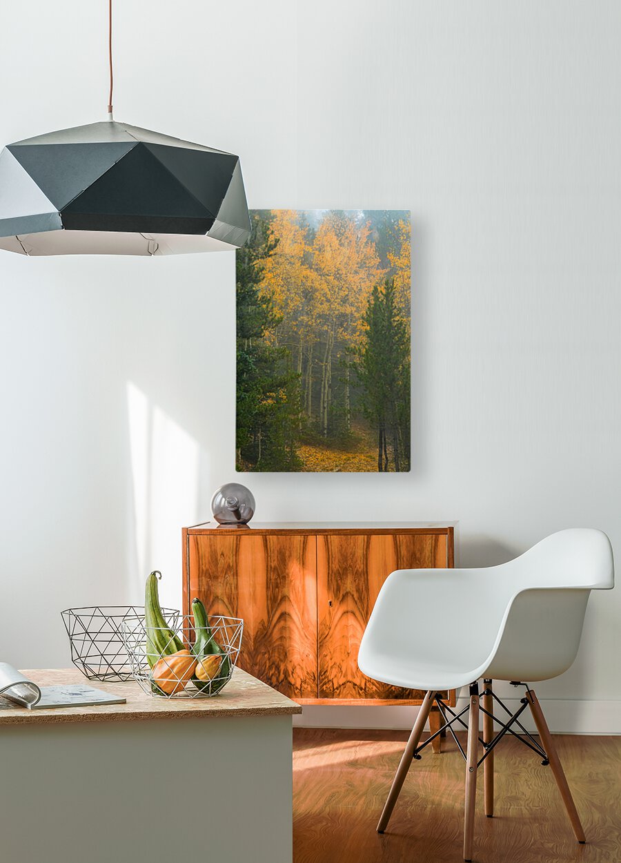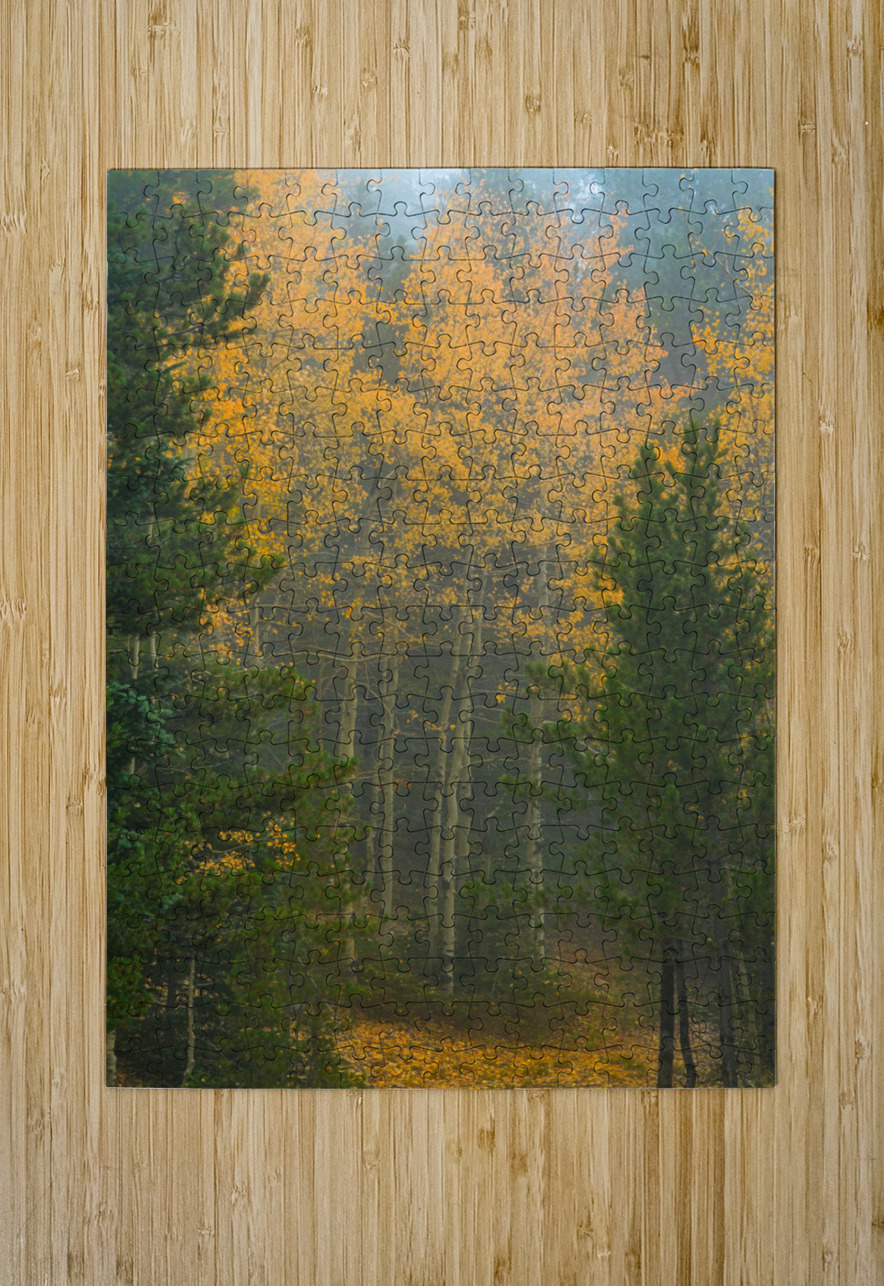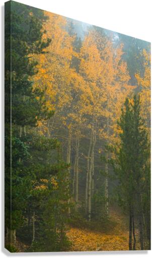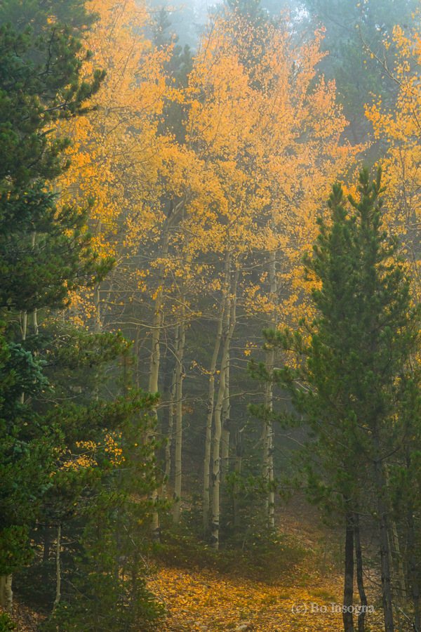 Beautiful golden aspen tree grove surrounded by pine trees with two like gate keepers.