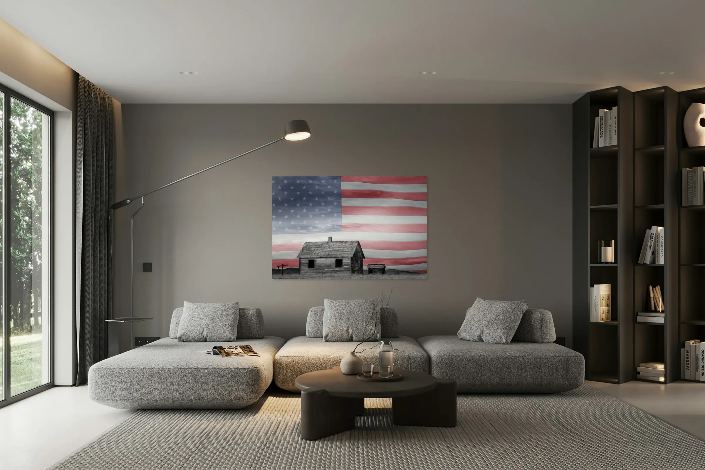A rustic rural little country house on the prairie with a USA Flag background. Striking fine are nature landscape black and white selective color photography print by James Bo Insogna Copyright(C) - All Rights Reserved Fine Art is Guaranteed to liven any decor. Great to decorate your home walls office walls cafe restaurant boardroom waiting room or almost any commercial space.