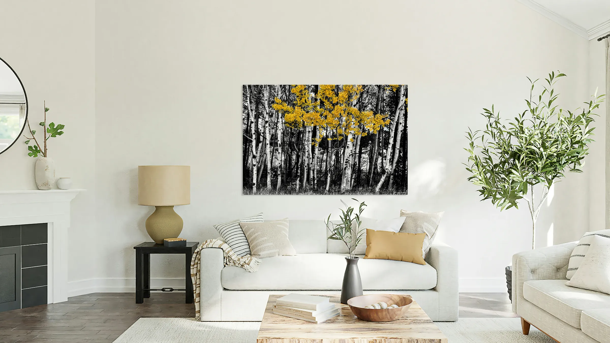 High contrast black and white of an aspen tree grove with selective Colorado on some of the bright orange color of the leaves. Photo: © James Bo Insogna Please note: copyright watermark will not be on the final print.