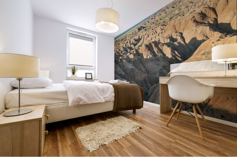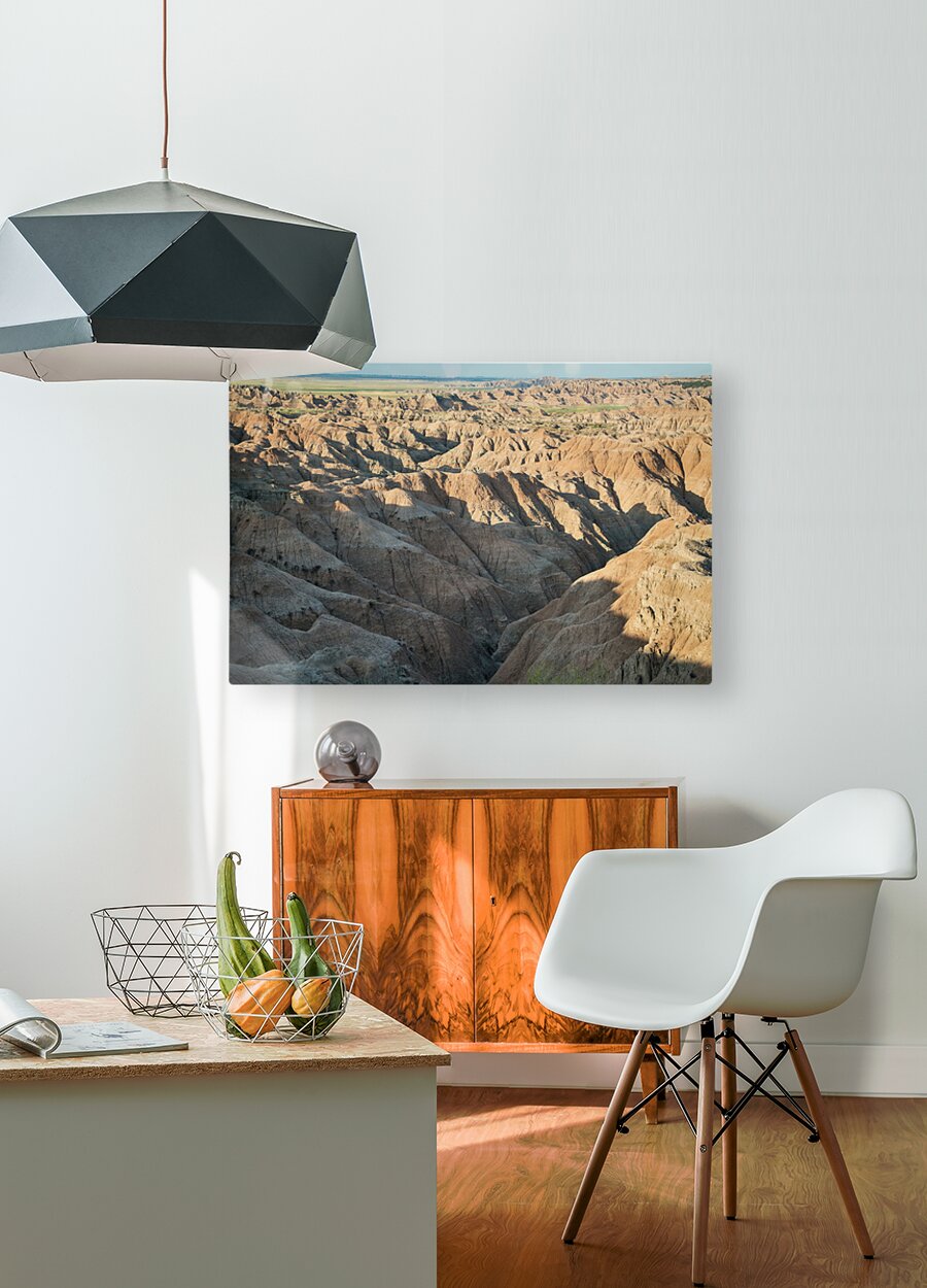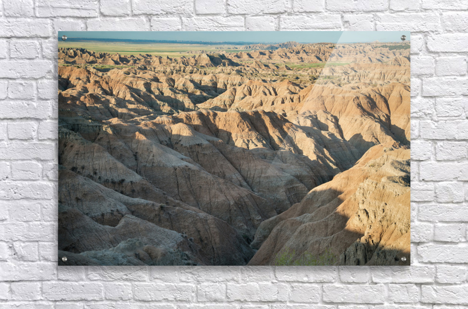 Natures Elegy: A Captivating Image of Badlands Canyons Cracks and the Dance of Shadow and Light Description: This striking photography image immerses viewers in the captivating landscape of the Badlands in South Dakota where canyons serve as a testament to the enduring forces of nature. The image captures the mesmerizing beauty of canyons highlighting their intricate cracks remarkable erosion patterns and the eternal interplay of shadow and light. The photograph invites viewers to explore the depths of the Badlands canyons where time has sculpted the rugged terrain with its relentless touch. Intricate cracks and crevices crisscross the canyon walls revealing the relentless power of erosion. These mesmerizing features create a natural mosaic narrating the story of the lands transformation over countless ages. As sunlight filters through the canyons depths shadows dance across the weathered rock formations. The contrast between light and shadow accentuates the textures and contours of the landscape unveiling the intricate details etched into the canyon walls. The ever-changing interplay between shadow and light adds depth and drama to the scene captivating the viewers gaze. Within this image the viewer can witness the eternal battle between natures forces. The cracks carved by wind and water bear witness to the unstoppable process of erosion while simultaneously showcasing the resilience of the land. It is a poignant reminder of the impermanence of existence and the continuous cycle of creation and transformation. As the viewer explores the image a sense of tranquility pervades the atmosphere. The quietude within the canyons creates a sanctuary for reflection and contemplation allowing one to connect with the profound majesty of natures artistry. It is an invitation to immerse oneself in the raw and untamed beauty of the Badlands. This photography image of the Badlands canyons captures the essence of an ever-evolving landscape shaped
