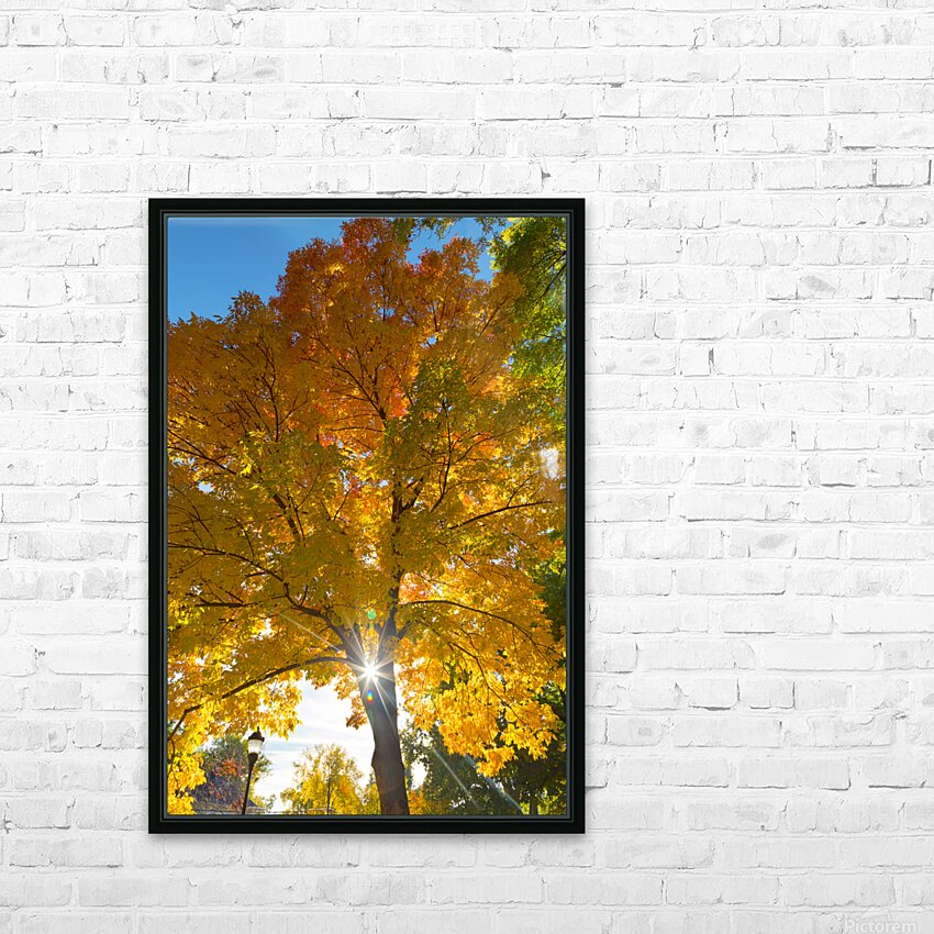 Pour obtenir "Stunning Autumn Tree Sunlight Through Colorful Leaves" dans une impression encadrée.